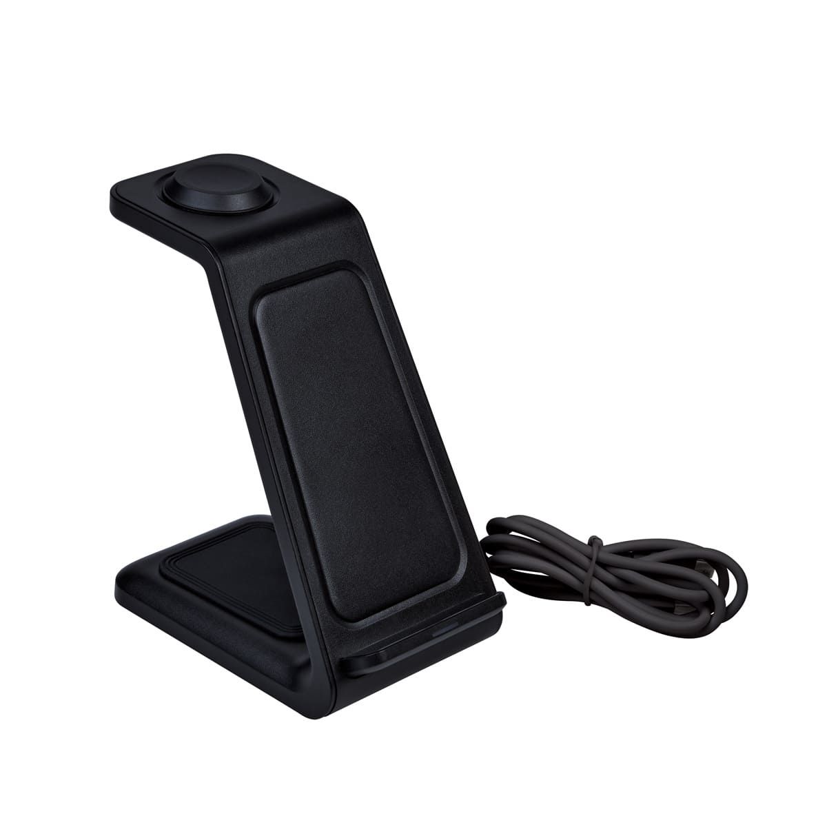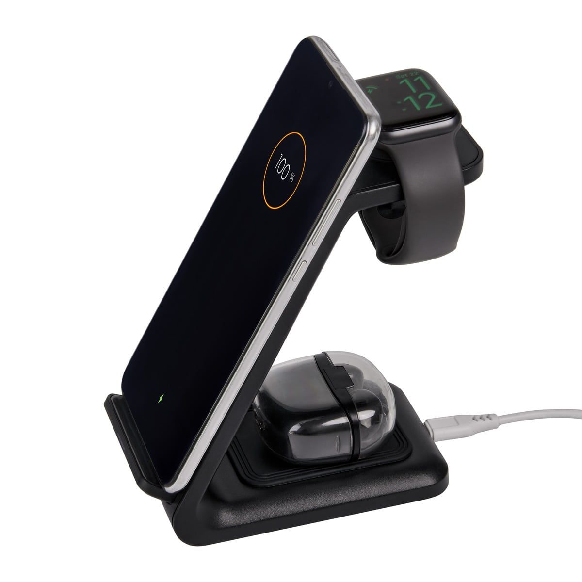 Cargador inalámbrico con triple función. Incluye estación de carga para smartphone, reloj inteligente y audífonos. Wireless de 15W / 10W / 7.5W / 5W / 3W. Incluye cable de 1m con conector tipo C. Compatible con dispositivos que cuenten con tecnología de carga inalámbrica.