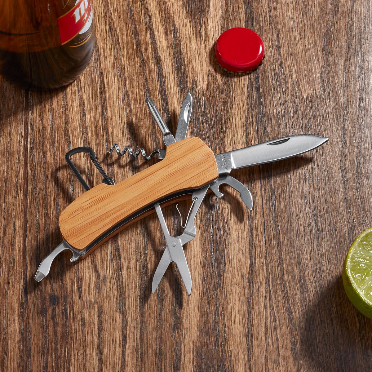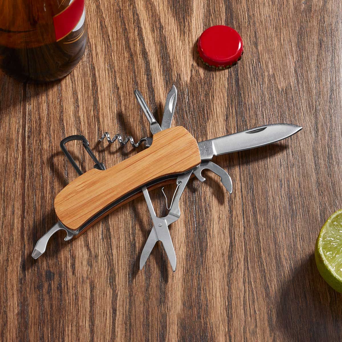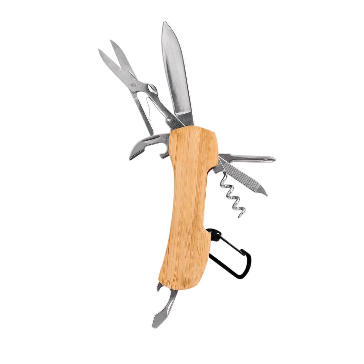 Navaja de bambú con 8 accesorios. Incluye serrucho, sacacorchos, abrelatas, tijeras, desarmador plano, destornillador de cruz, lima de uñas y gancho. Estos accesorios te permiten enfrentar cualquier situación con confianza y practicidad.