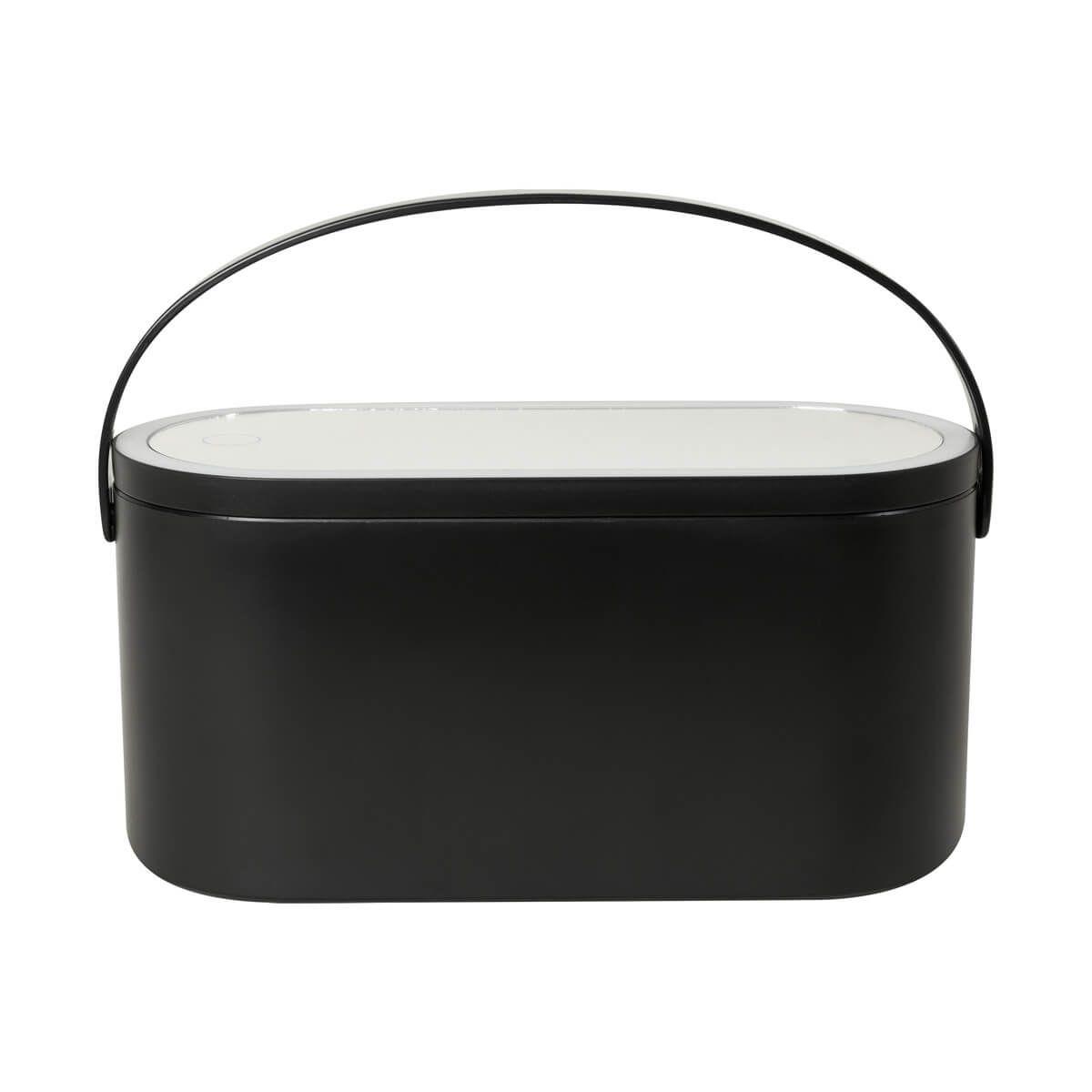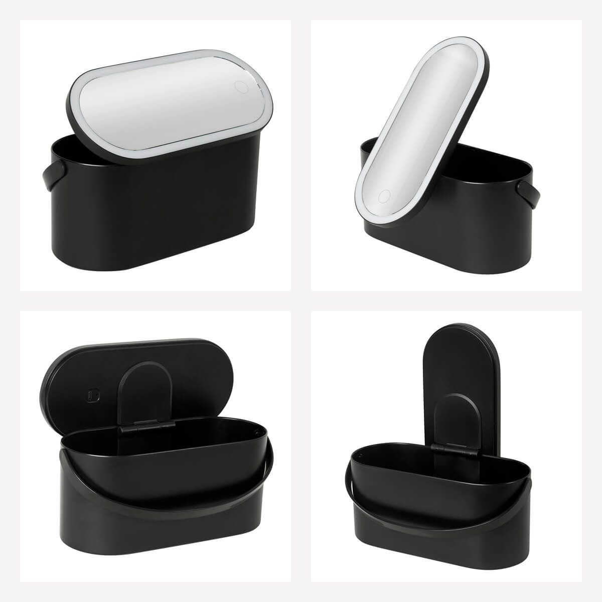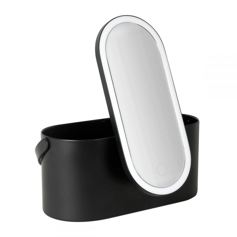 Organizador de cosméticos con espejo integrado. Su tapa incluye un espejo con luz LED ajustable a 3 intensidades, se activa presionando por 5 segundos el botón touch. El diseño versátil permite ajustar el espejo en diferentes posiciones, incluso desmontarlo y utilizarlo de manera individual, brindando comodidad y precisión al maquillarte. Compacto y elegante, es el accesorio ideal para mantener tus accesorios organizados. Batería recargable e incluye cable con conexión USB-C y caja individual.