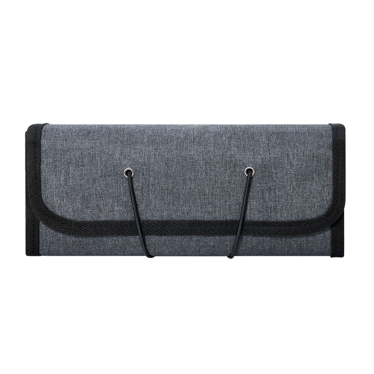 Organizador enrollable para accesorios. Contiene dos compartimentos con cierre y malla, un compartimento intermedio con bandas elásticas y un compartimento con dos bolsillos. Cierre con elástico.