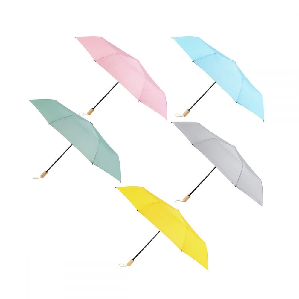 Paraguas de bolsillo de 8 paneles. Sistema de abertura manual. Mango de madera con asa elástica. Incluye funda individual con botón metálico que permite abrir y guardar el paraguas fácilmente.
