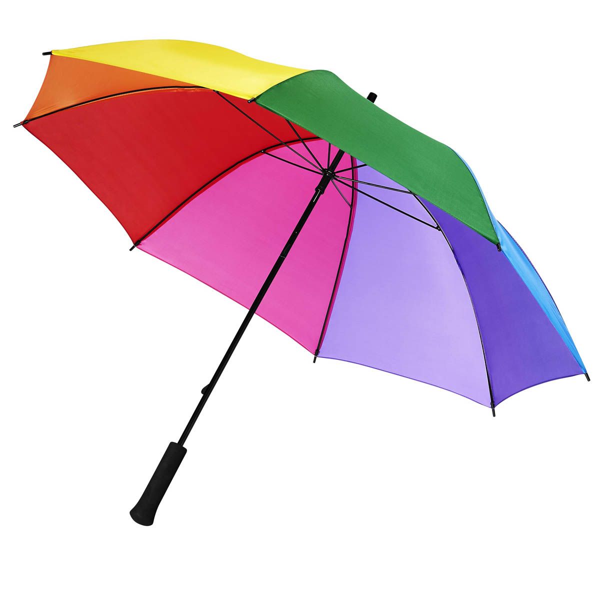 Paraguas de 8 paneles, cada panel de un color. Sistema manual. Mango de esponja. Su diseño arcoíris, colorido y alegre refleja la diversidad y la inclusividad.