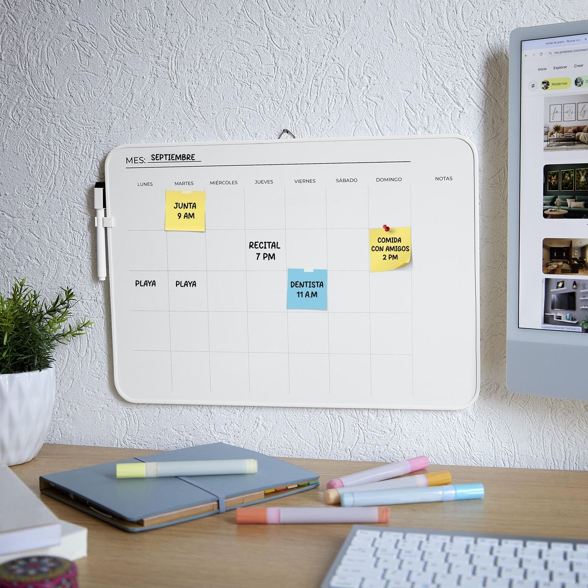 Pintarrón con planeador mensual ideal para organizar tus prioridades. Incluye marcador con borrador y gancho superior para colgarlo fácilmente en tu espacio de trabajo. Su retícula te permite personalizar mes y días, perfecto para uso diario en el hogar, oficina o colegio. Este producto por ser últimas piezas puede presentar alguna variación, no se aceptan devoluciones.
