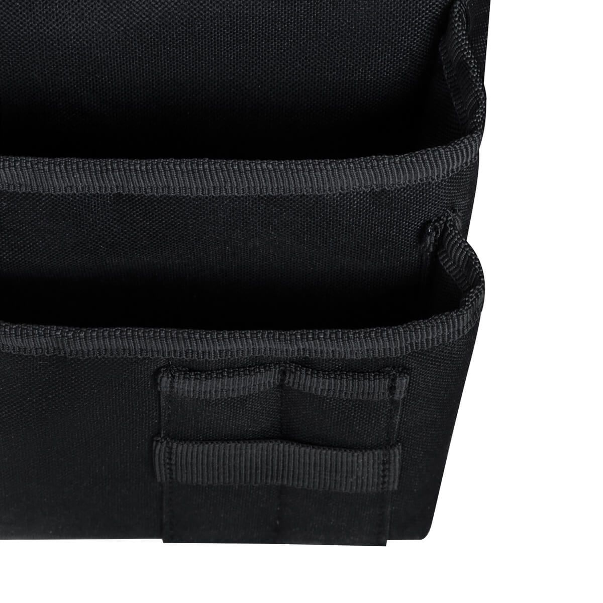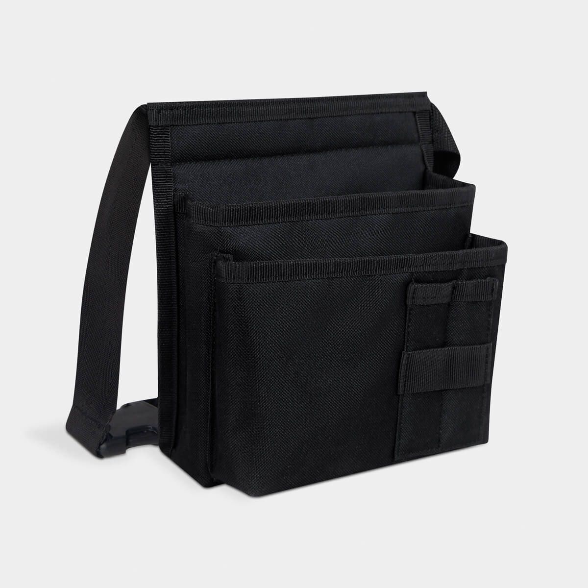 Bolsa para herramientas con cinturón ajustable y broche de plástico. Incluye dos amplios compartimentos para colocar y tener acceso rápido a llaves, cintas, pinzas etc… En la parte frontal se agregan dos compartimentos para destornilladores y 1 cinta porta martillo.