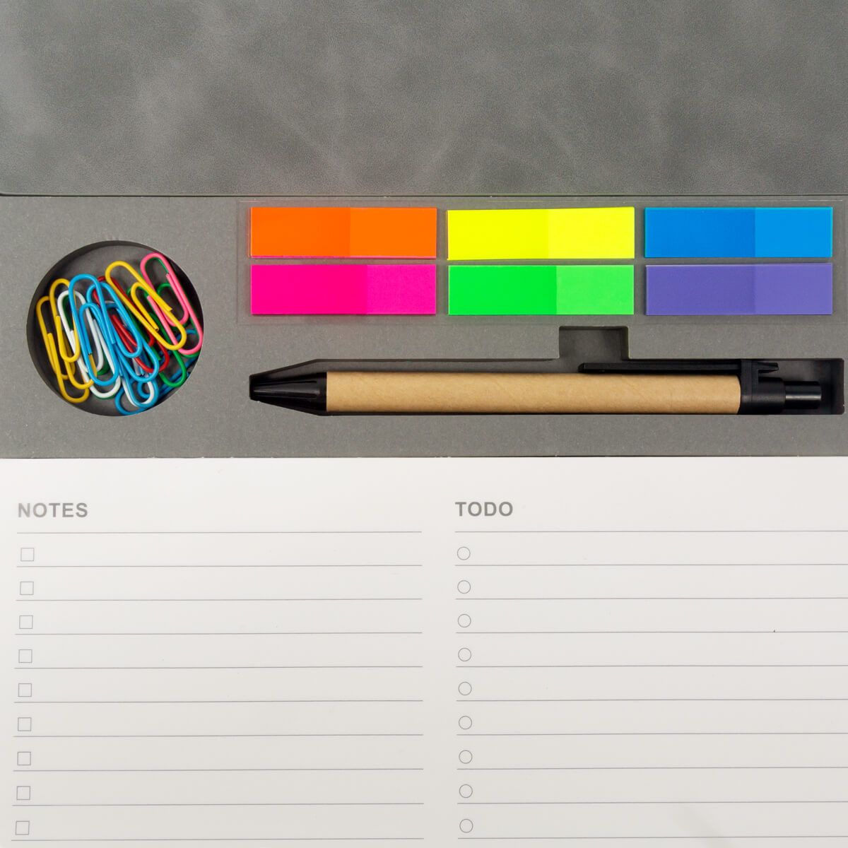 Porta notas de curpiel con sistema plegable que se convierte en soporte para smartphone y organizador de bolígrafos. Incluye un bolígrafo ecológico, 9 clips metálicos, block con 80 notas y banderillas adheribles de 6 colores. Ideal para mantener todo a la mano en escritorio o reuniones.