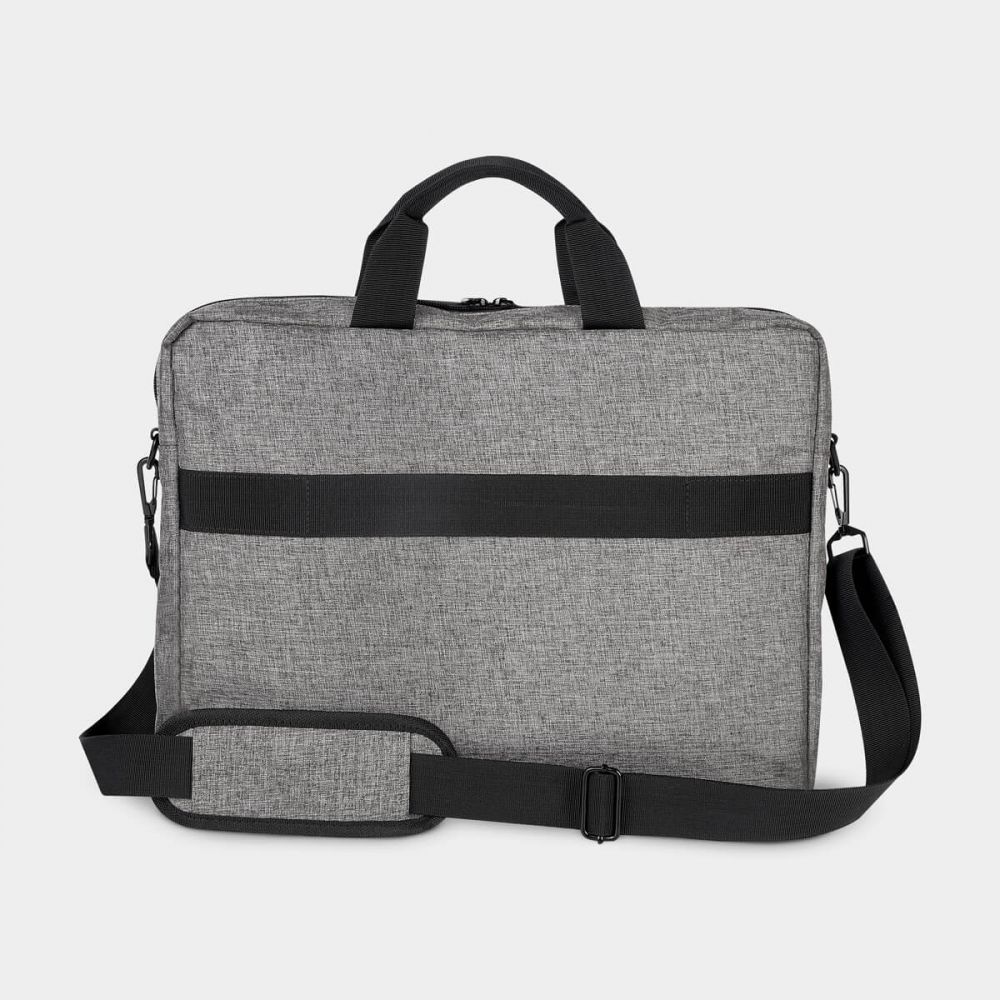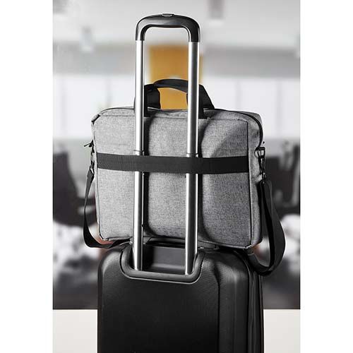 Bolsa principal con cierre y espacio para laptop de 15", organizador y bolsa interna con cierre, 2 bolsas frontales con cierre y aditamento especial trasero para colocar en trolley. Incluye correa ajustable y desmontable. Asas de agarre superior.