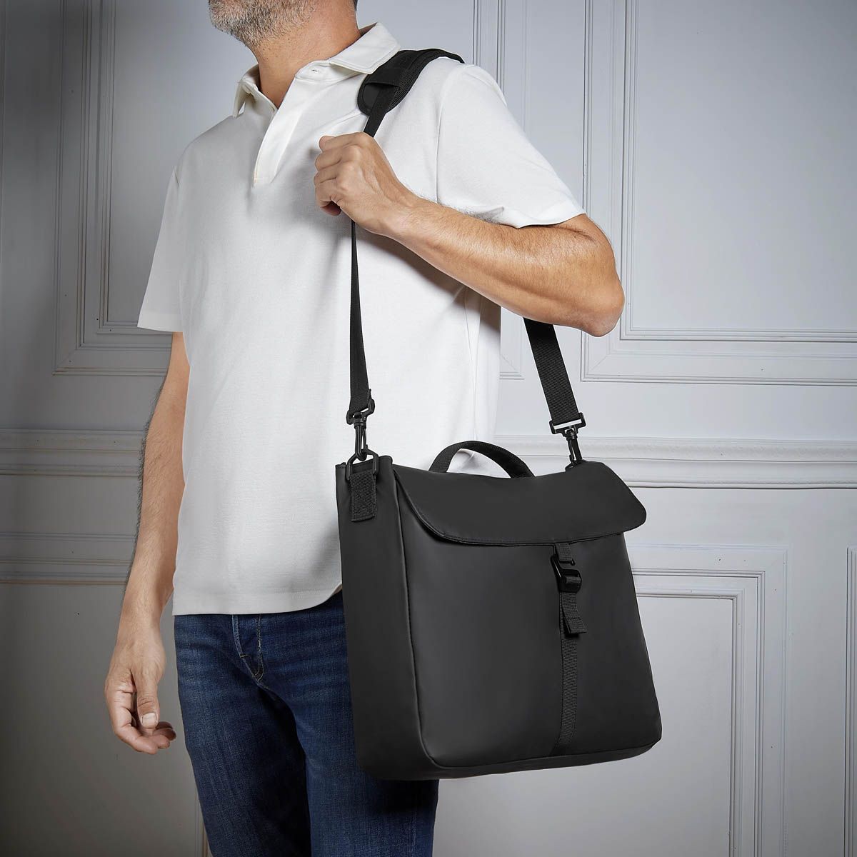 Elegancia y funcionalidad se unen en este portafolio. Con un compartimiento principal seguro, cerrado por un gancho metálico, ofrece espacio para una laptop de hasta 15". Su asa para hombro con almohadilla integrada, brinda una mayor comodidad al transportarla. Esta mochila es la combinación perfecta de estilo y practicidad para el profesional moderno.