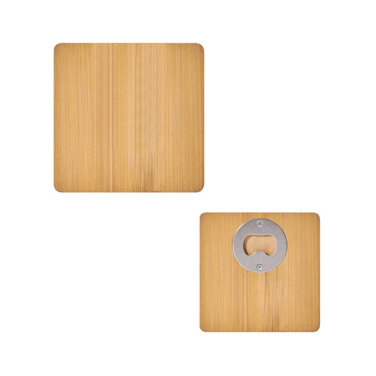 Portavasos de bambú con destapador para botellas. La madera es un producto natural el cual puede presentar variaciones en tonalidades y vetas.