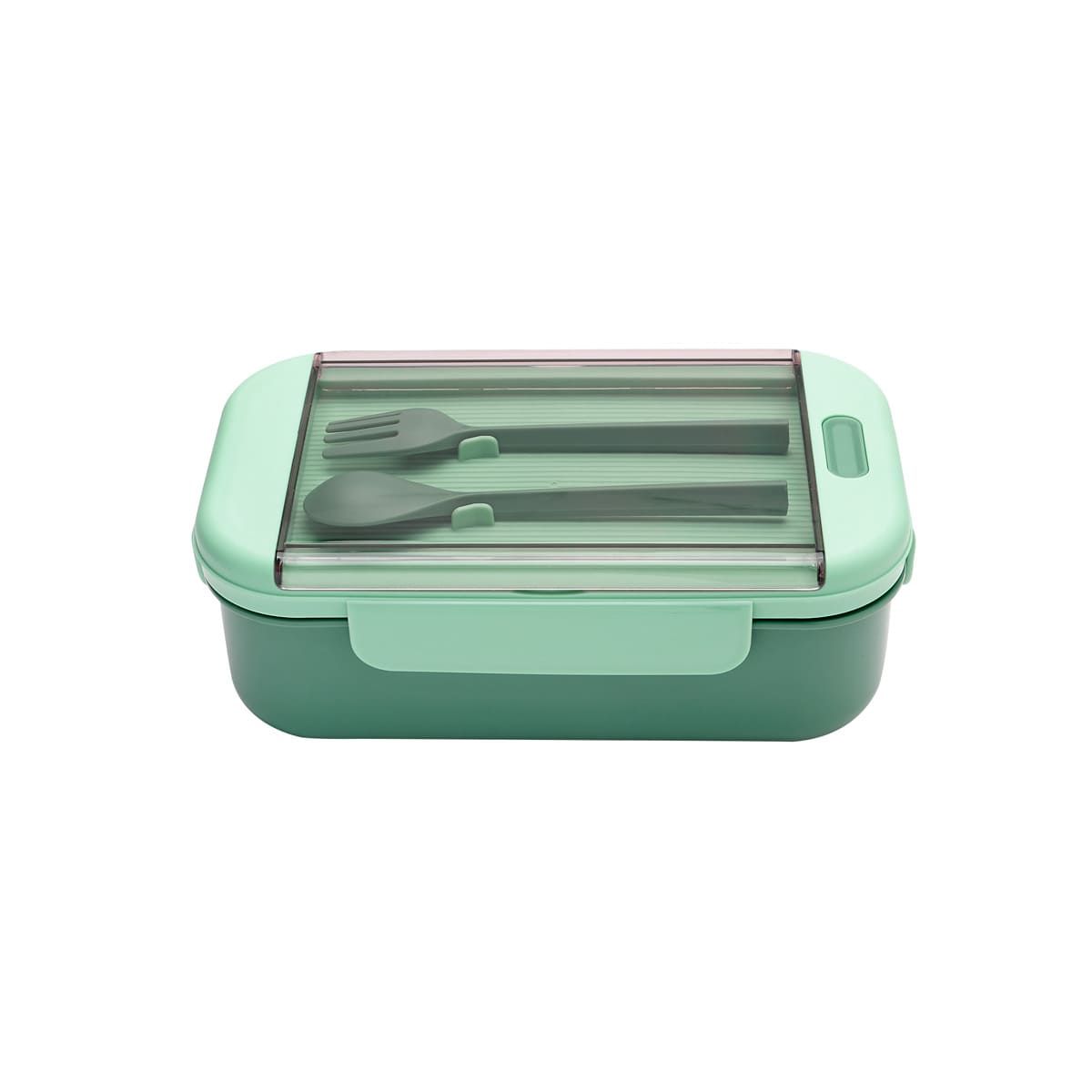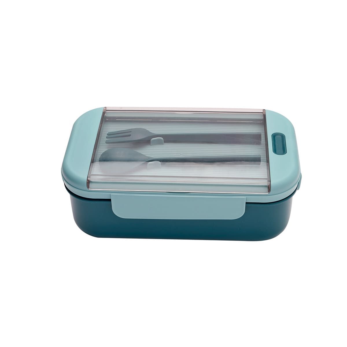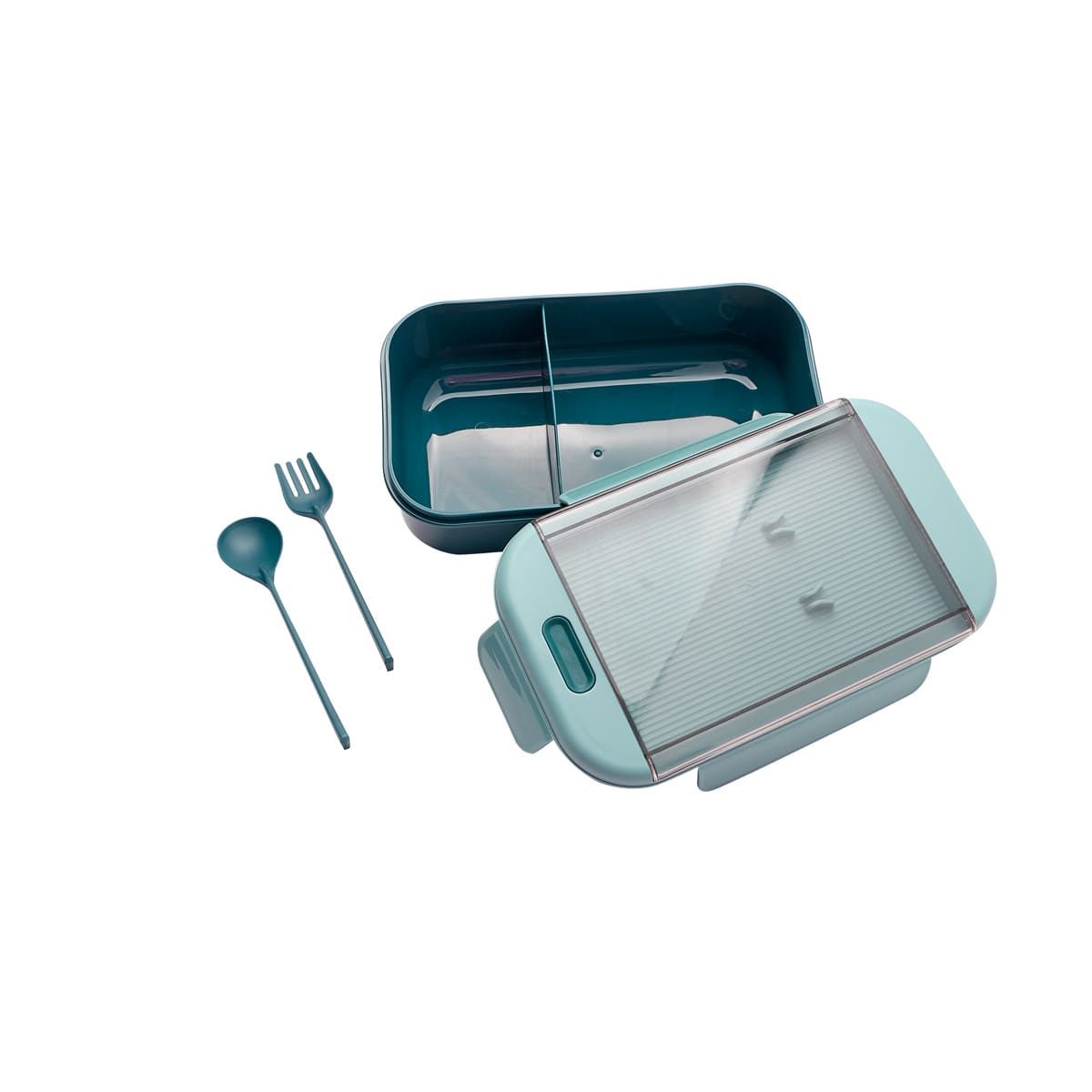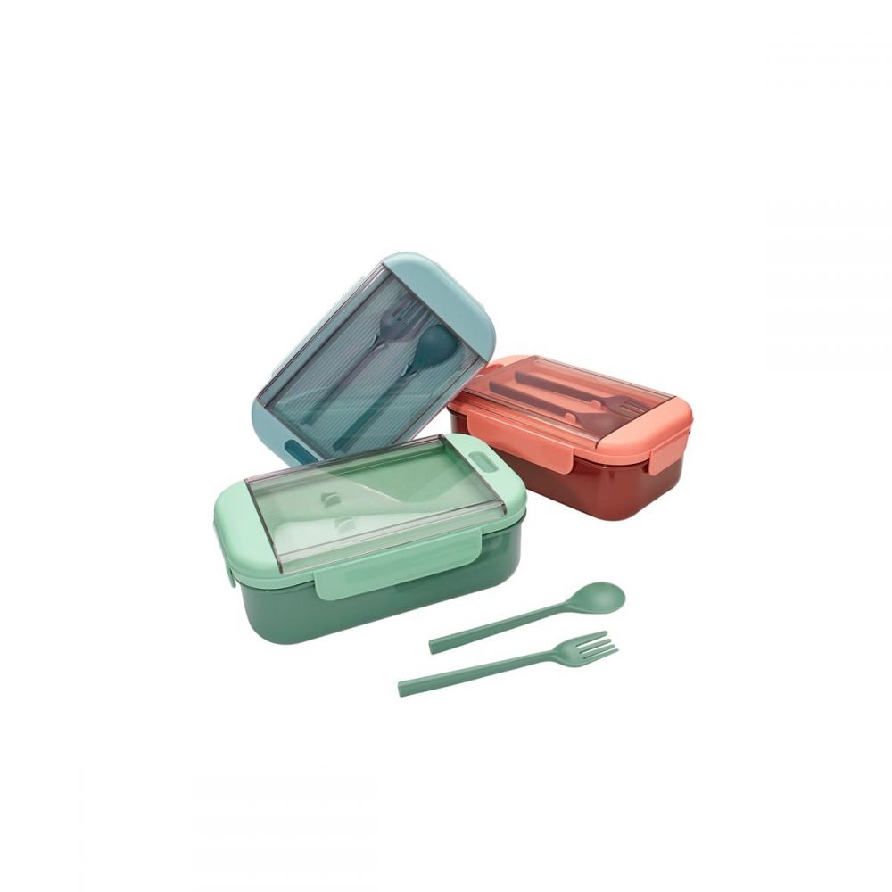 Contenedor para almacenar alimentos. Al interior cuenta con división para separar tu comida. Su tapa es con cierre hermético para evitar derrames. Incluye cuchara, tenedor de plástico y caja individual.