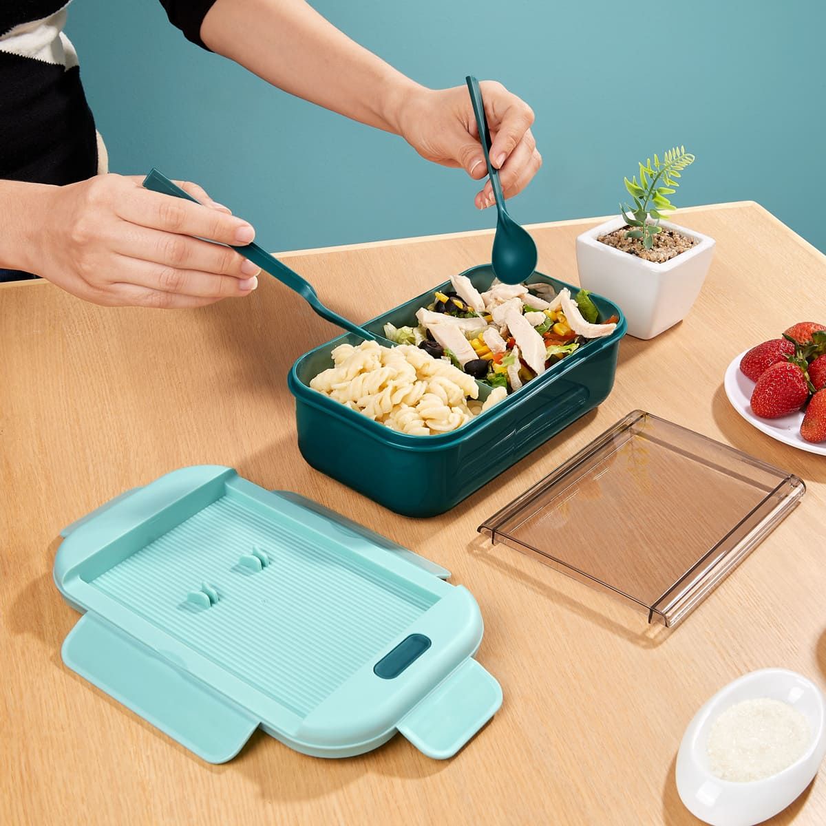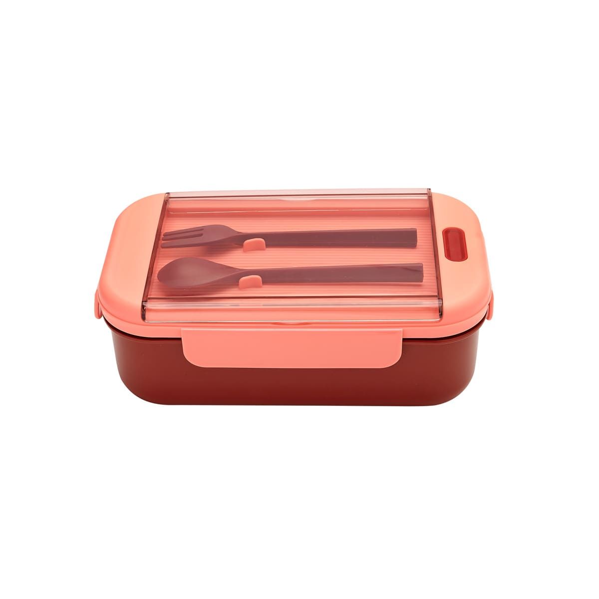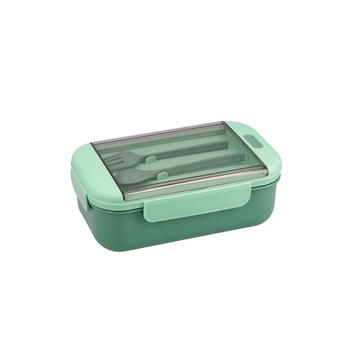 Contenedor para almacenar alimentos. Al interior cuenta con división para separar tu comida. Su tapa es con cierre hermético para evitar derrames. Incluye cuchara, tenedor de plástico y caja individual.