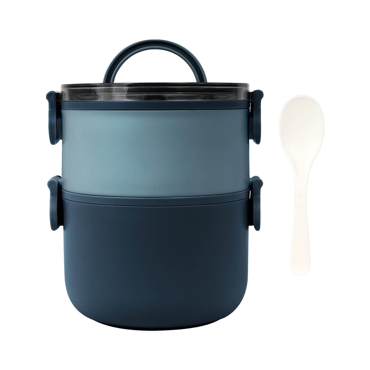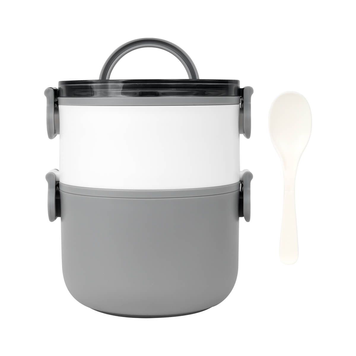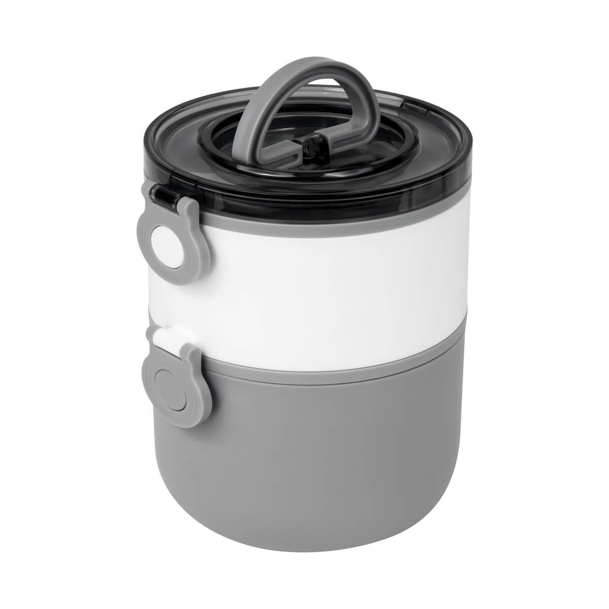 Contenedor de alimentos con dos pisos independientes que permite separar tus alimentos y no mezclar sabores. Fabricado con una pared sencilla de plástico, ideal para el uso de microondas. Cada compartimento cuenta con su tapa hermética para evitar derrames y sus broches laterales ayudan unir o separar cada elemento. Incluye cuchara de plástico, tapa con asa plegable y caja individual. Apto para el uso en microondas y lavavajillas.
