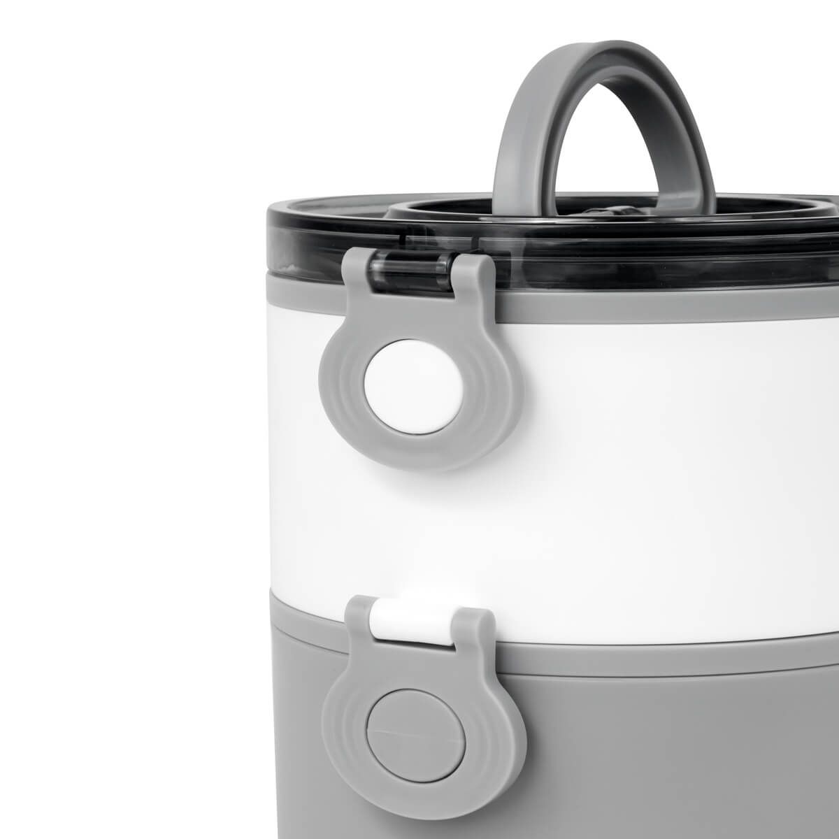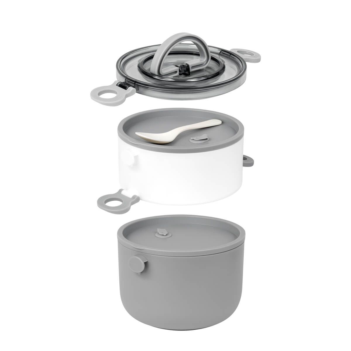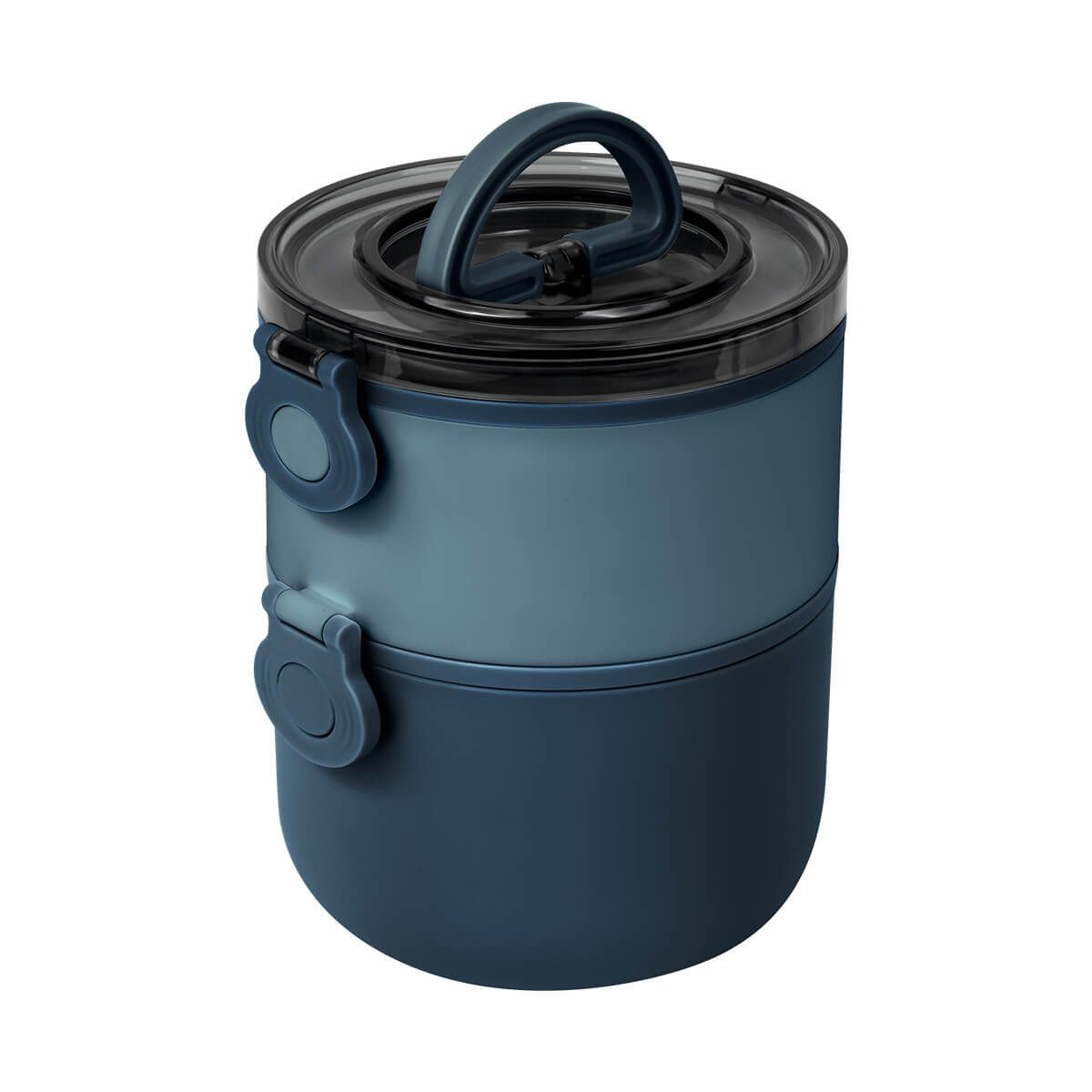 Contenedor de alimentos con dos pisos independientes que permite separar tus alimentos y no mezclar sabores. Fabricado con una pared sencilla de plástico, ideal para el uso de microondas. Cada compartimento cuenta con su tapa hermética para evitar derrames y sus broches laterales ayudan unir o separar cada elemento. Incluye cuchara de plástico, tapa con asa plegable y caja individual. Apto para el uso en microondas y lavavajillas.