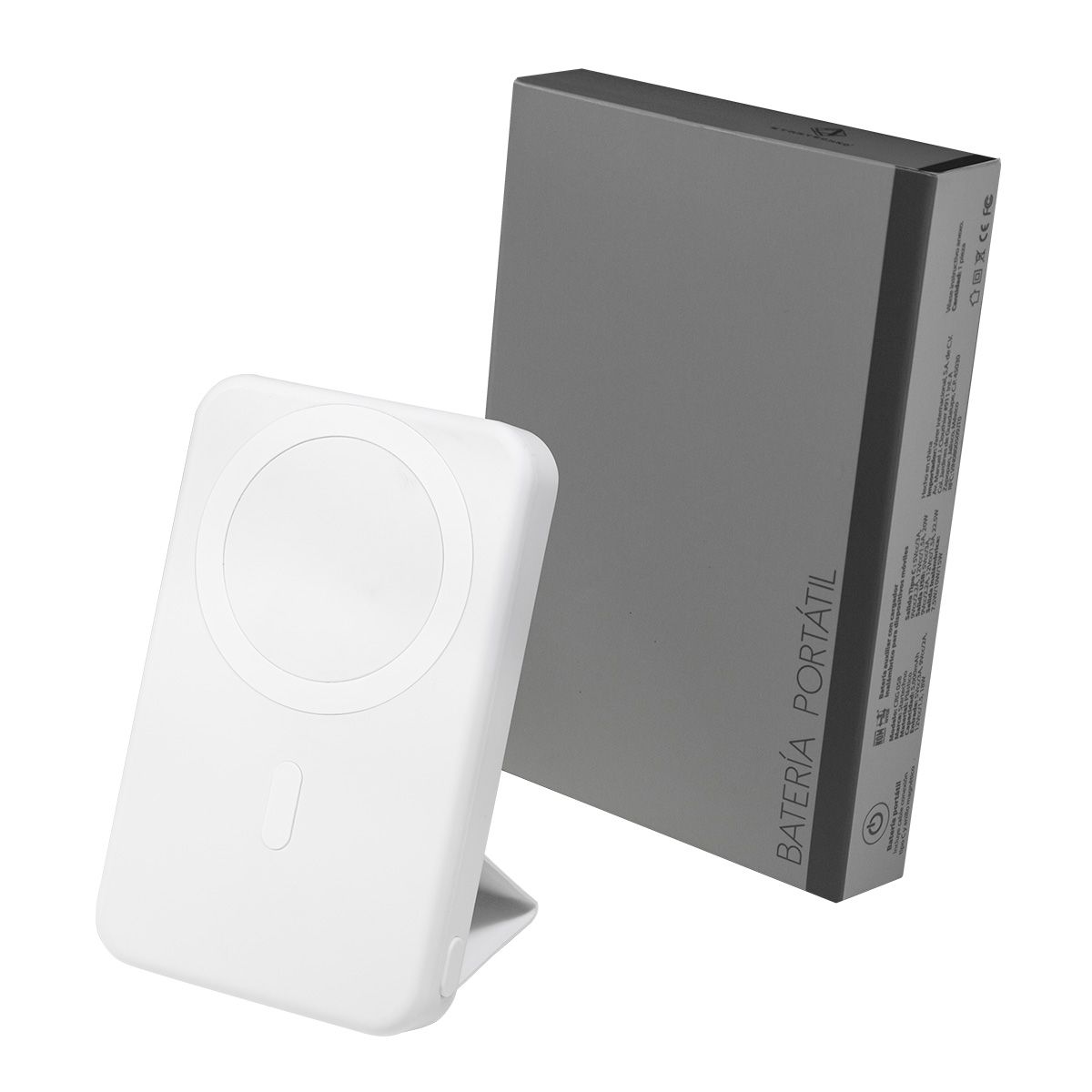 Batería auxiliar para smartphone de 5,000 mAh, con terminado rubber y cargador inalámbrico magnético. Incluye solapa plegable con puntas imantadas que funciona como soporte. Cuenta con un puerto USB y un puerto tipo C, compatible para carga de dispositivos y recarga de la batería, con salida de 7.5W / 10W / 15W. Incluye botón de encendido, display indicador de carga, cable cargador tipo C y caja individual.