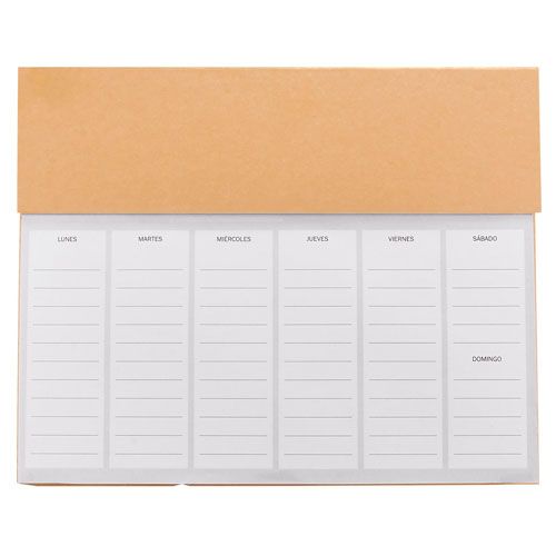Programador semanal con 100 hojas. Incluye bolígrafo ecológico, clips y banderillas adheribles de 6 colores.