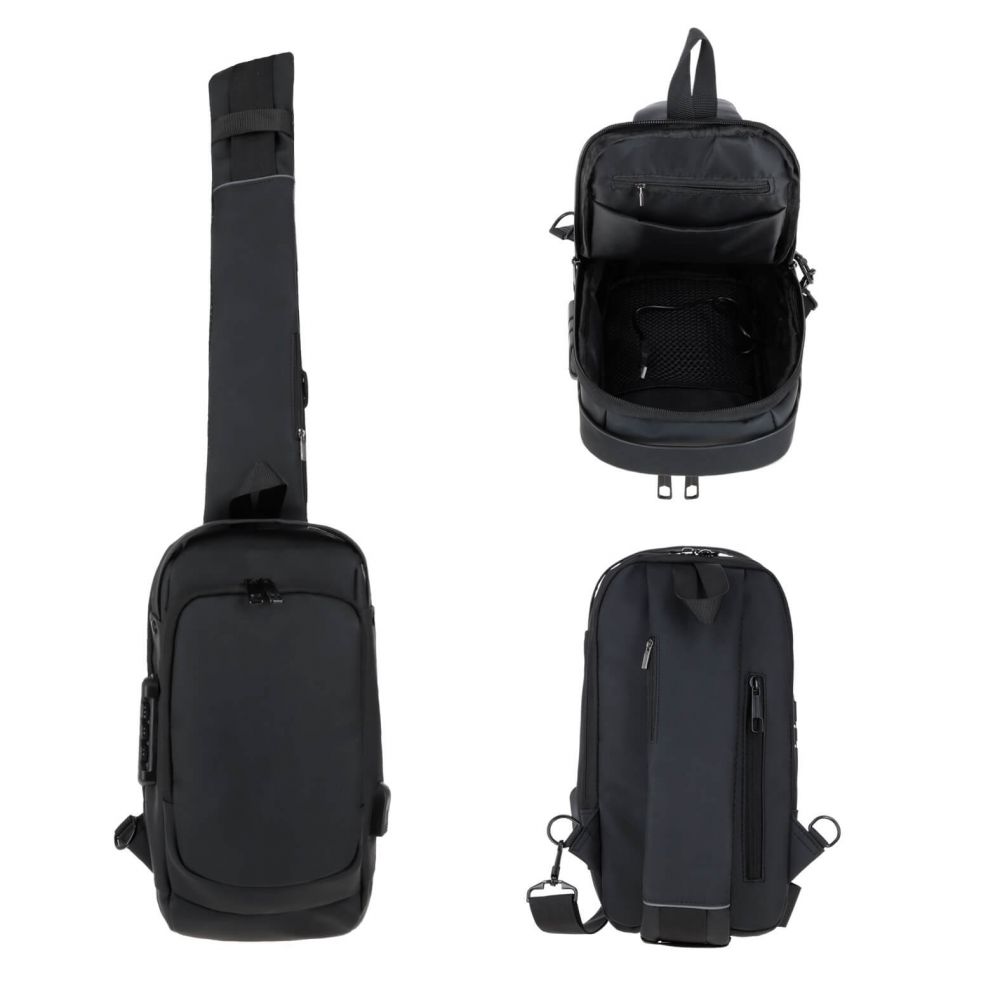 Bolsa de hombro con 4 compartimentos.1 compartimento principal con doble cierre, candado de seguridad, 3 compartimentos internos y entrada lateral de batería portátil (Incluye cable), además de 2 compartimentos secundarios y 1 mini compartimento en la correa ajustable, cuenta con 2 asas superiores.