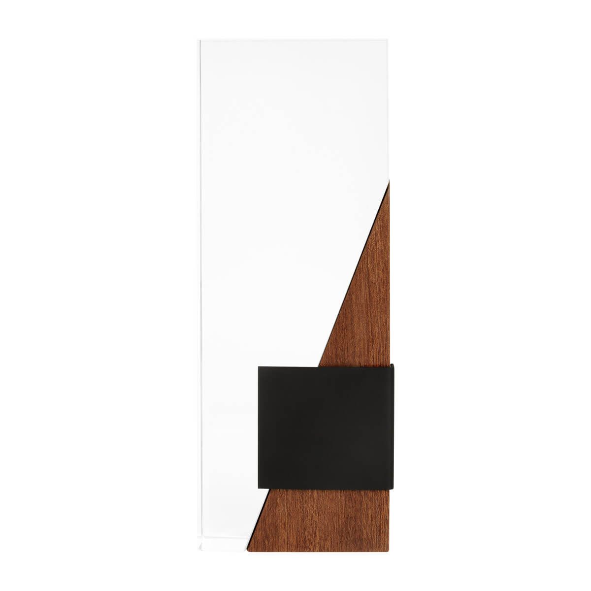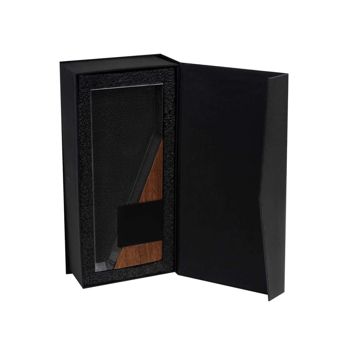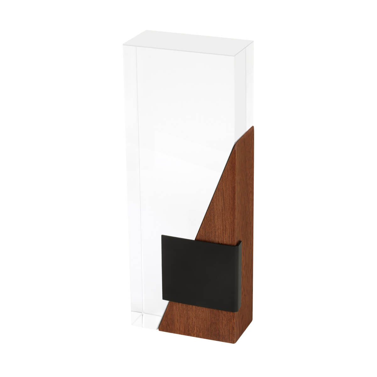 Reconocimiento asimétrico que combina materiales como vidrio, madera y metal, destacando un diseño moderno y minimalista. Cuenta con una placa metálica para su fácil grabado. Destaca un evento memorable, una mención honorifica o celebración especial. Incluye caja de regalo con broche imantado para cerrar y esponja interna para protección. La madera es un producto natural el cual puede presentar variaciones en tonalidades y vetas