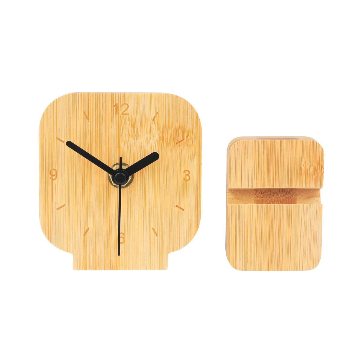 Reloj de escritorio con base desmontable. Diseño compacto, ideal para escritorio o buró. Las manecillas silenciosas evitan el ruido "Tic Tac". La madera es un producto natural el cual puede presentar variaciones en tonalidades y vetas.