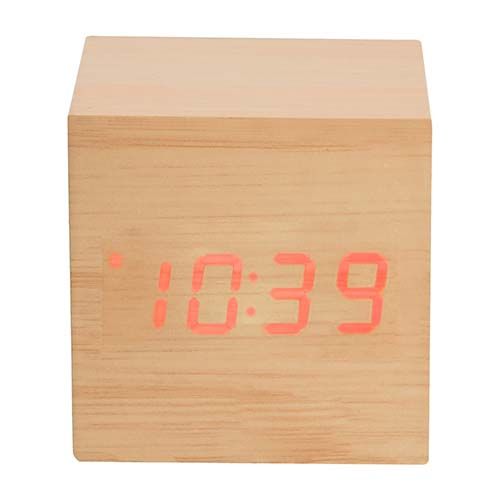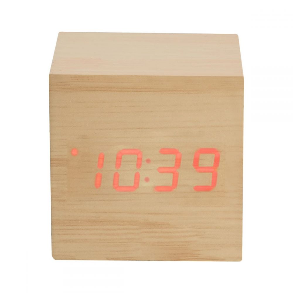 Reloj de madera con LED. Funciones: hora, alarma (se pueden programar 3 alarmas), calendario y temperatura. Baterías (3 pilas AAA) no incluidas. Incluye caja individual.