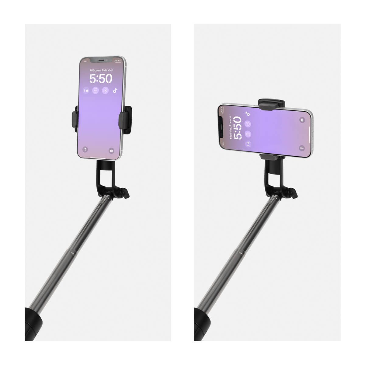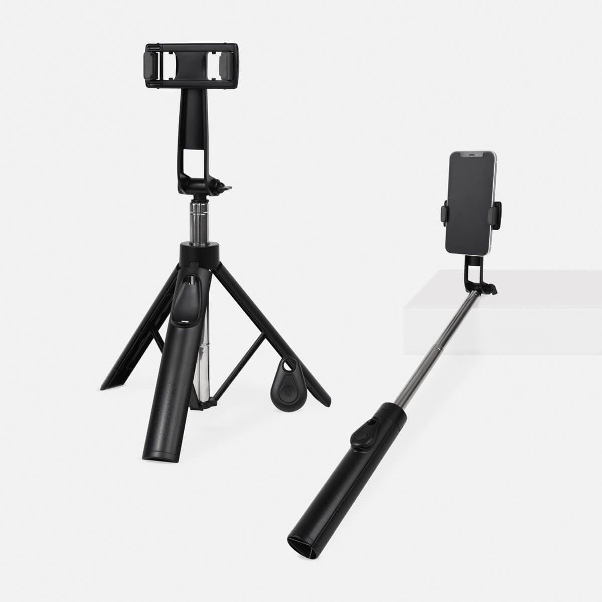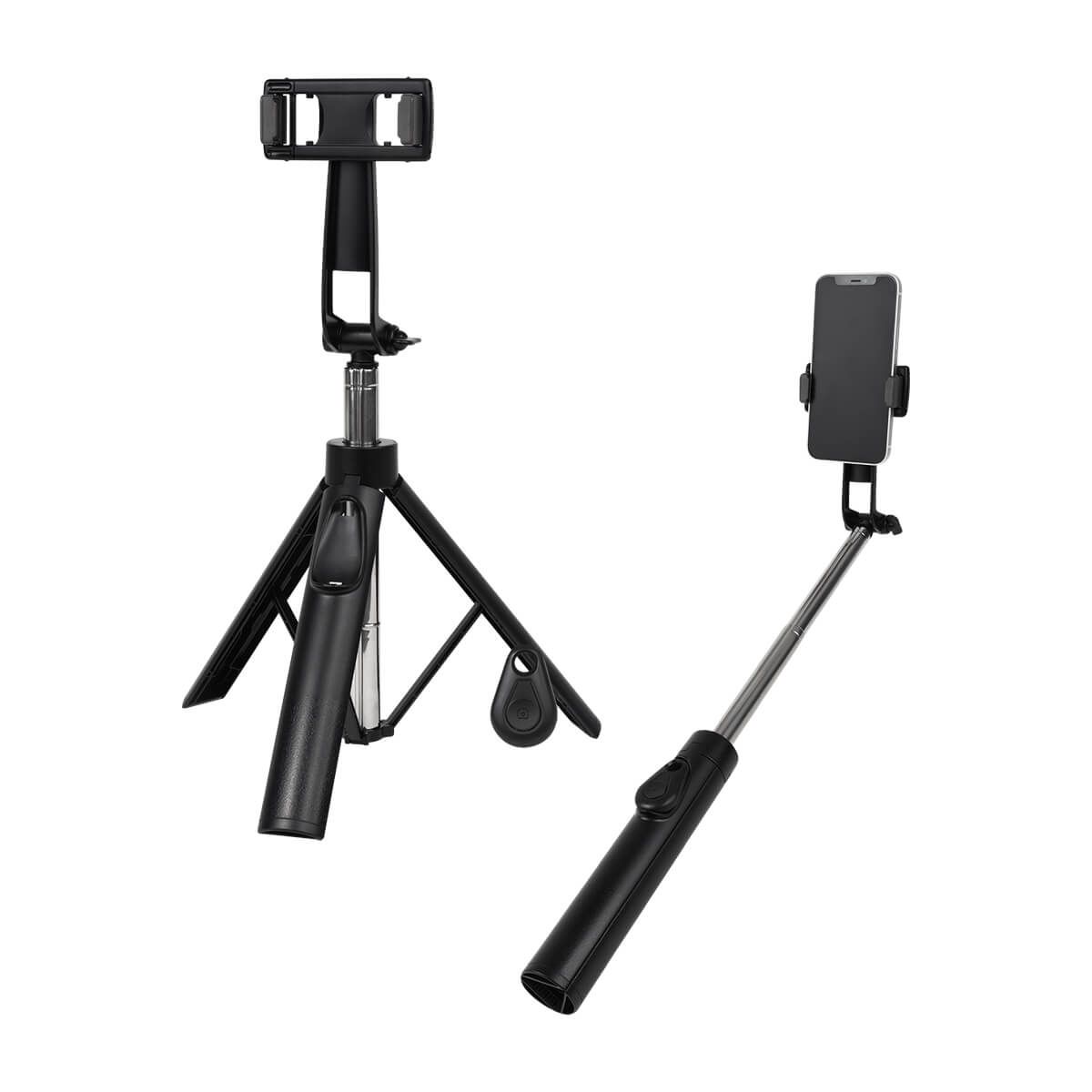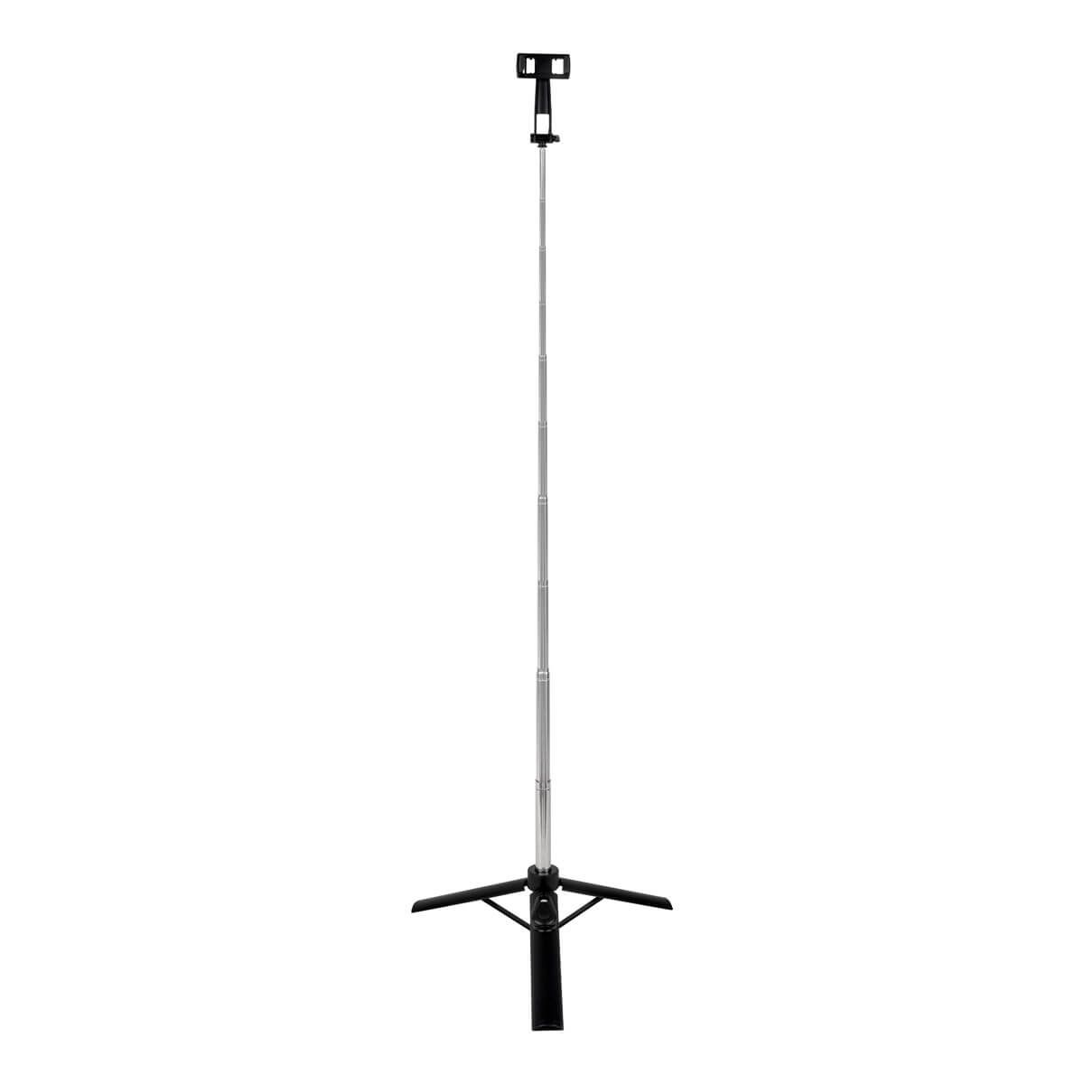 Selfie stick con tripié amplio para mayor estabilidad. Incluye control remoto Bluetooth con alcance de hasta 10 m, ideal para capturar fotos o videos a distancia. Su brazo extensible de 86 cm y su holder ajustable garantizan ángulos perfectos para cada toma. Perfecto para selfies, videollamadas o grabaciones creativas. El control remoto funciona con batería de botón (incluída).