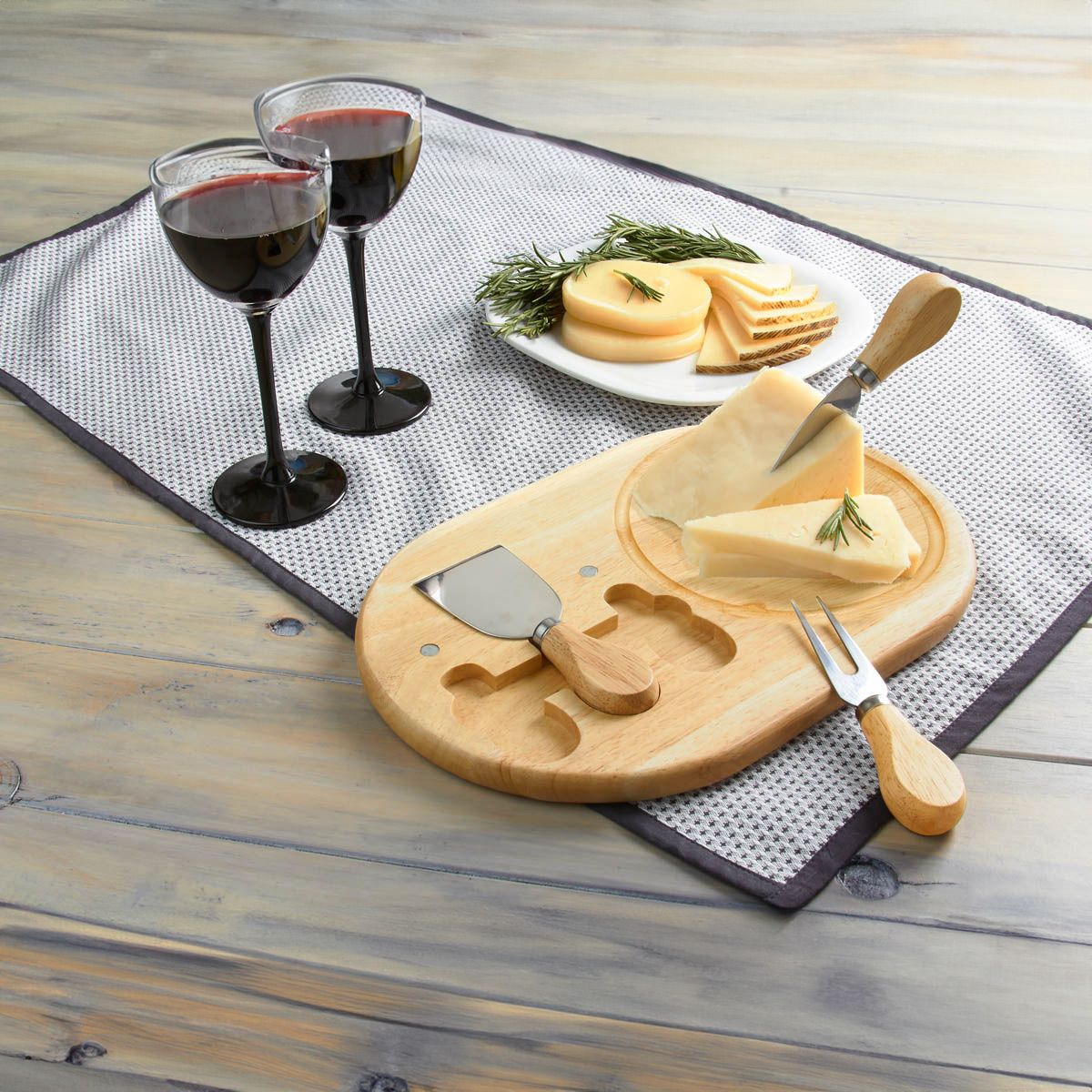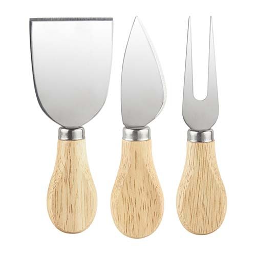 Set con 1 tabla con 2 cuchillos y 1 tenedor para quesos. Incluye caja individual. La madera es un producto natural el cual puede presentar variaciones en tonalidades y vetas.