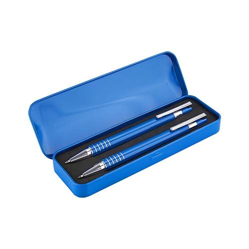 Bolígrafo y lapicera 0.5 mm. Mecanismo pulsador. Incluye estuche metálico.