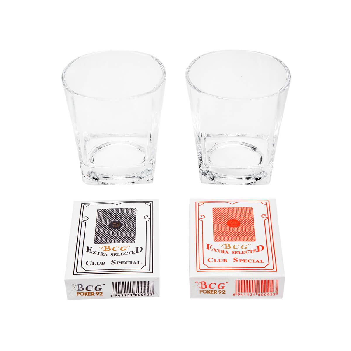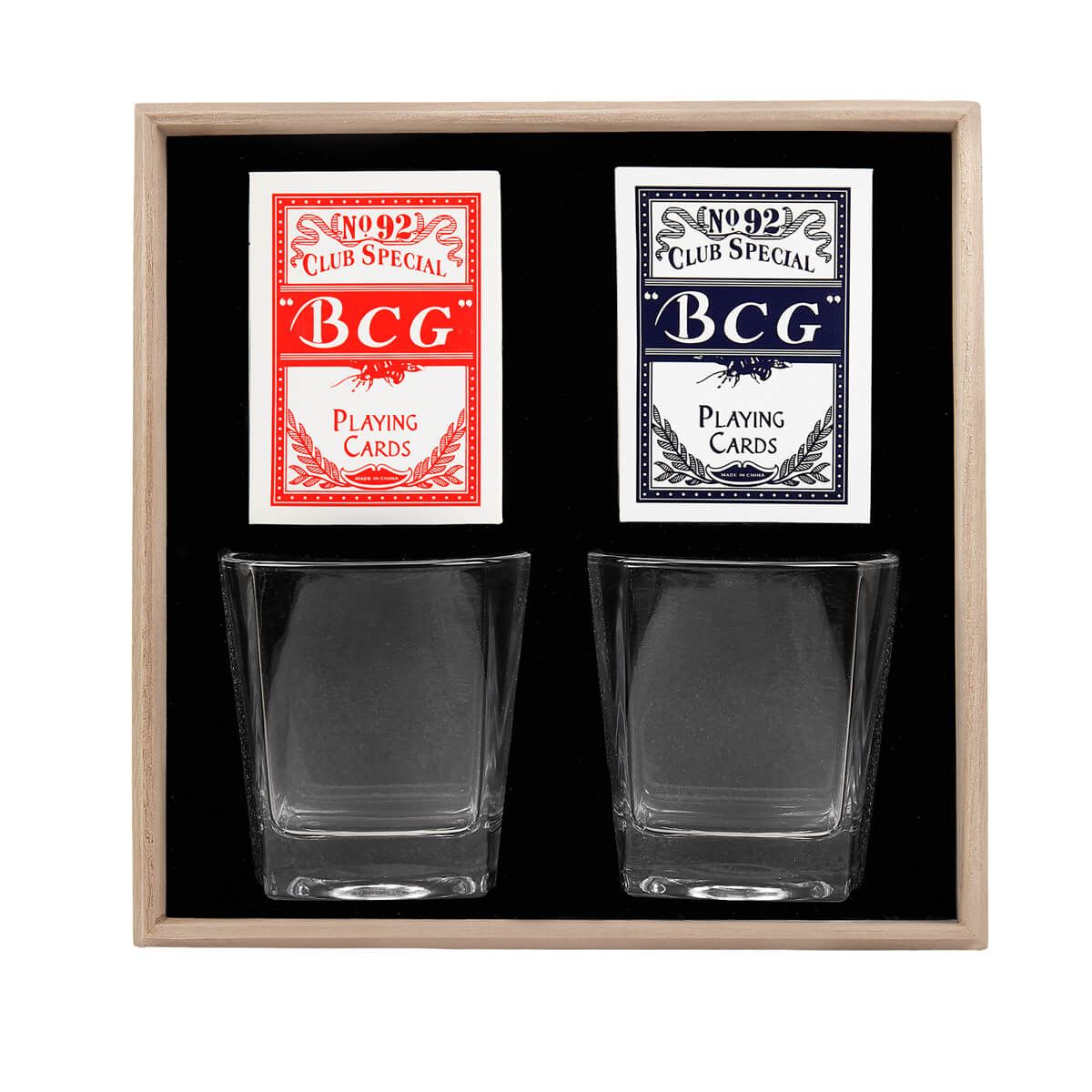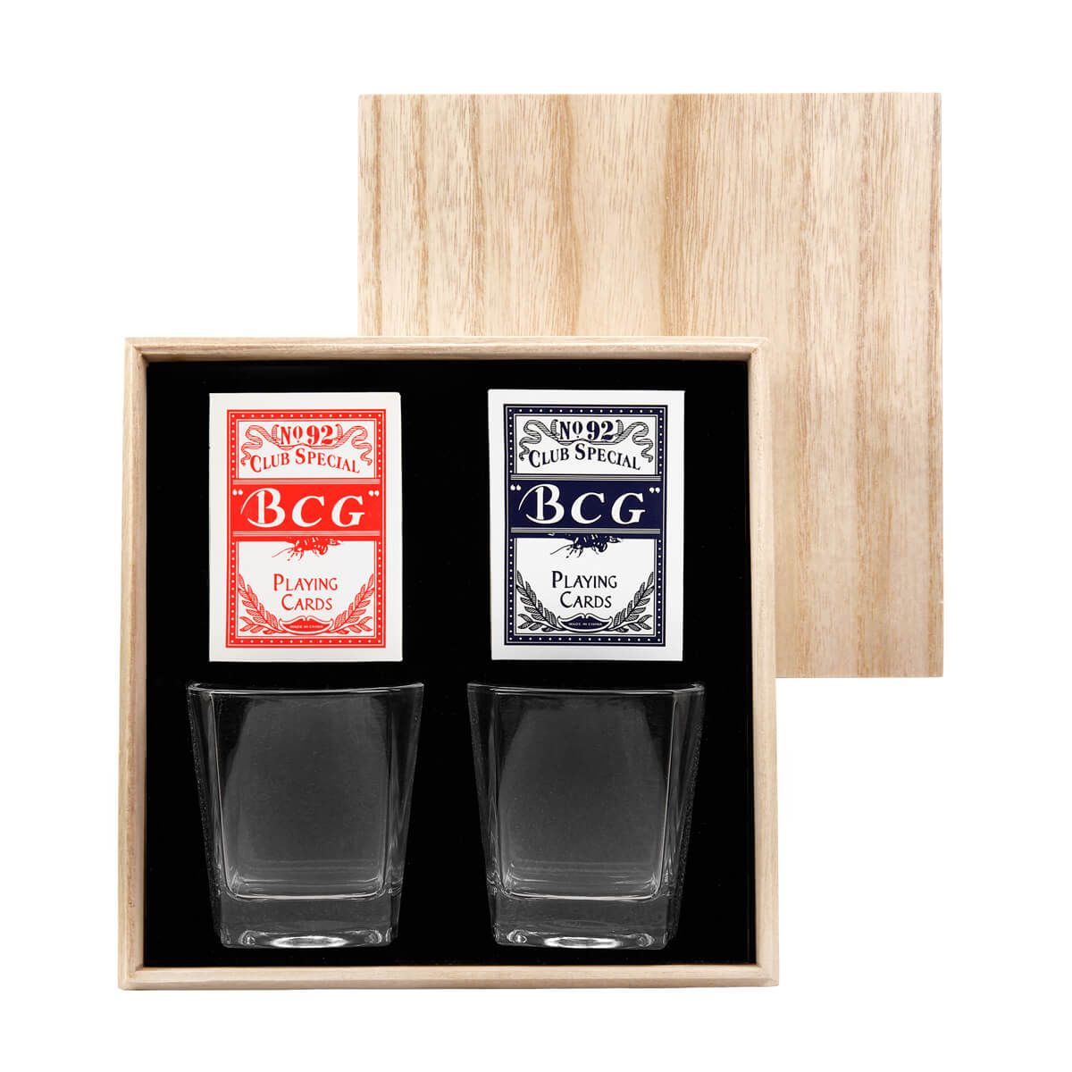Set de bar con 2 vasos whiskeros de cristal y 2 barajas para juego. Su presentación lo hace perfecto para ocasiones especiales, desde celebraciones personales hasta un obsequio corporativo. Incluye estuche de madera.