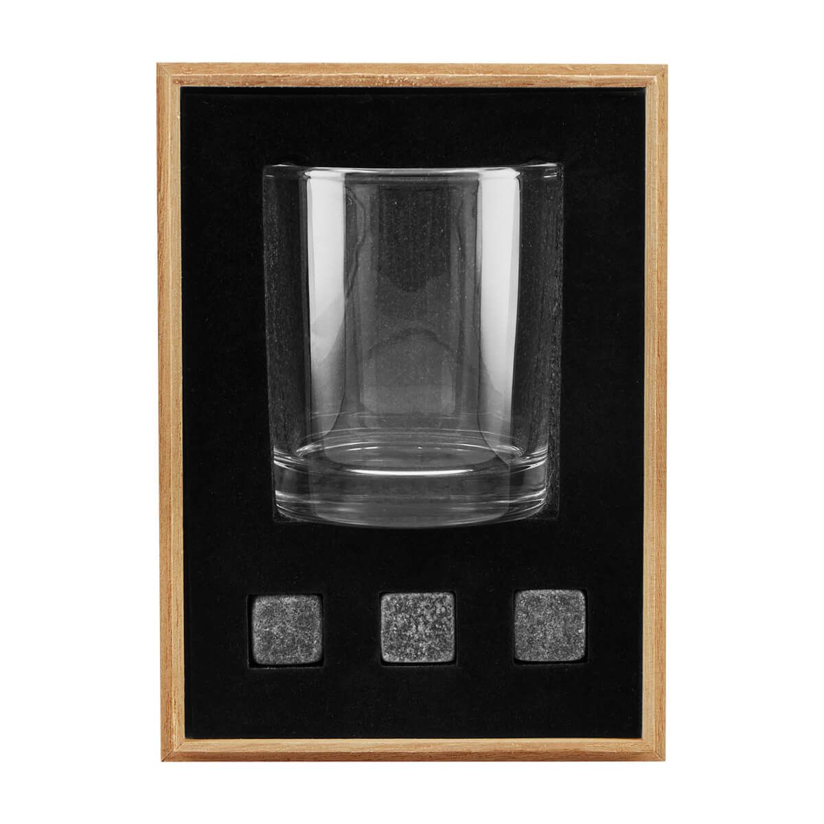 Set de bar. Incluye vaso de cristal, 3 enfriadores de piedra y estuche de madera.