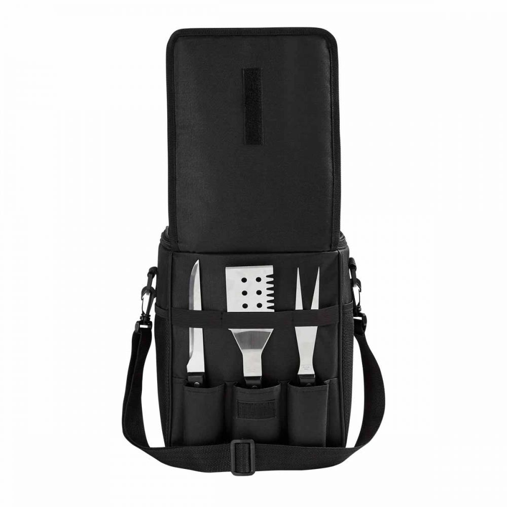 Bolsa principal con función de hielera. Capacidad para 12 latas. Incluye bolsa frontal con 3 compartimentos internos para el set de cuchillo, espátula y tenedor. 2 Bolsas laterales de red y correa ajustable.