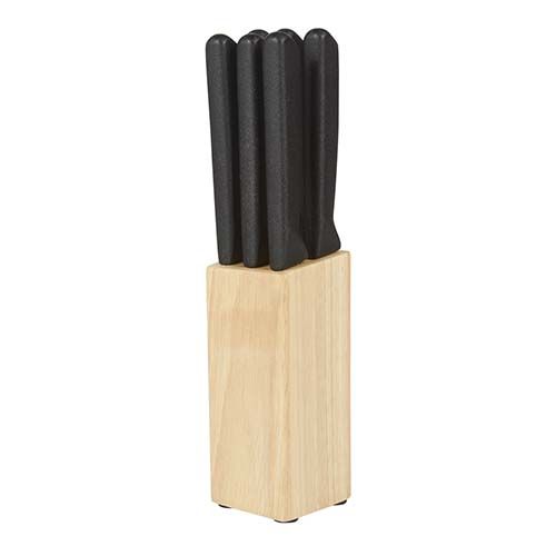 Incluye 6 cuchillos y base de madera. La madera es un producto natural el cual puede presentar variaciones en tonalidades y vetas. Este producto por ser últimas piezas puede presentar alguna variación, no se aceptan devoluciones.
