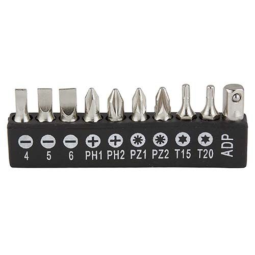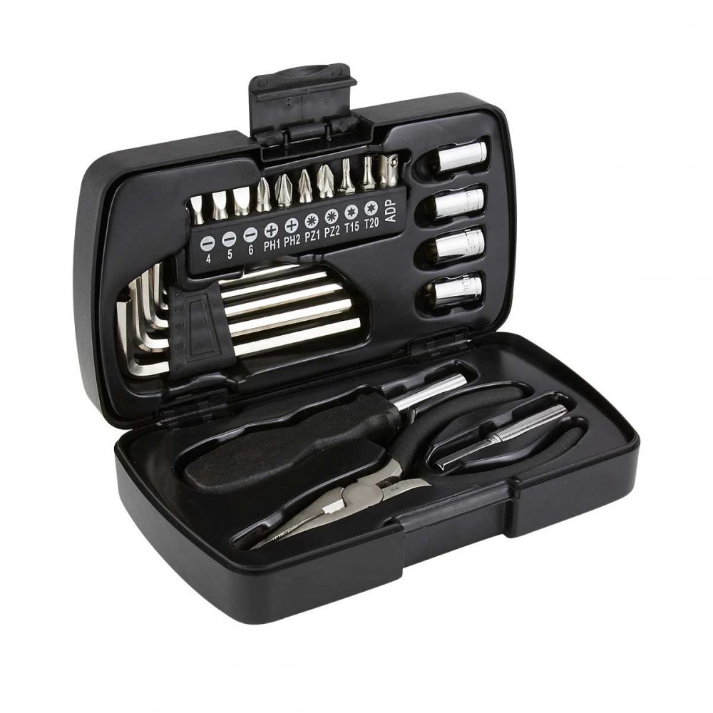 Contiene desarmador y 10 puntas diferentes e intercambiables, 5 llaves hexagonales, dado extensión, 4 dados y pinzas de punta. Incluye estuche.