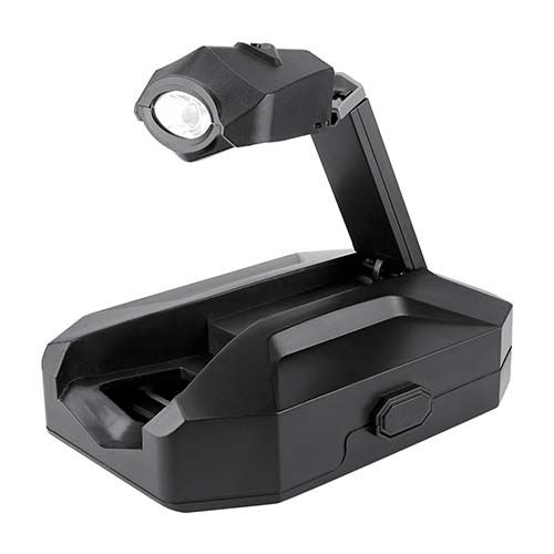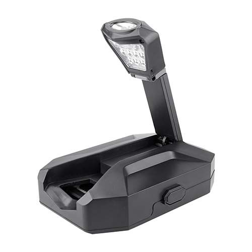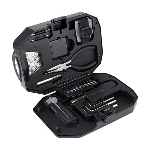 Contiene 2 desarmadores relojeros con 4 puntas distintas, dado extensión, desarmador con 10 puntas diferentes e intercambiables, 3 llaves hexagonales, pinzas de punta, flexómetro de 1m, cúter, lámpara desmontable con 13 LEDS, utiliza 3 baterías AAA (no incluidas) y correa ajustable con adaptador para lámpara. Incluye estuche.