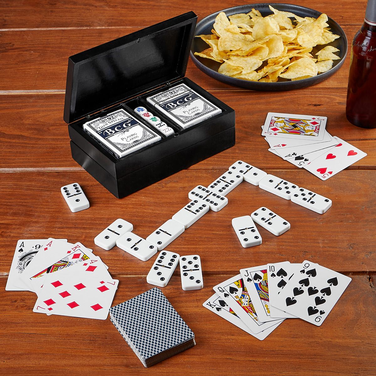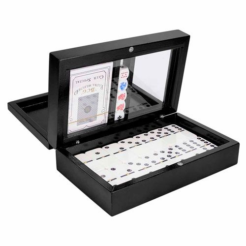 Incluye estuche de madera con 5 dados, 2 barajas plastificadas y dominó de 28 piezas.