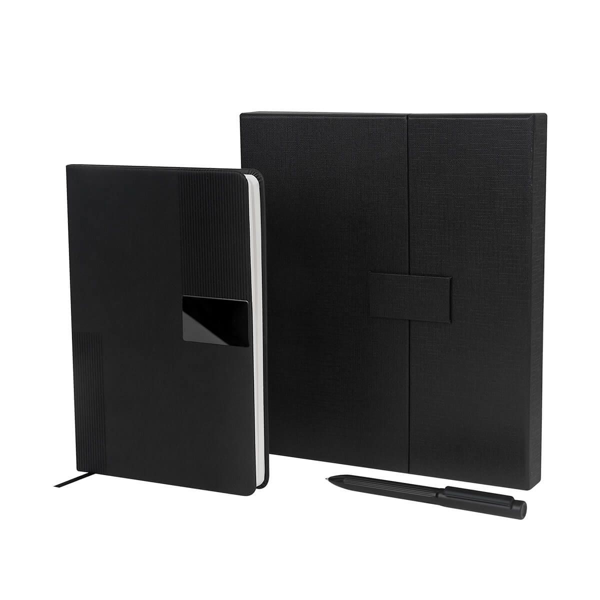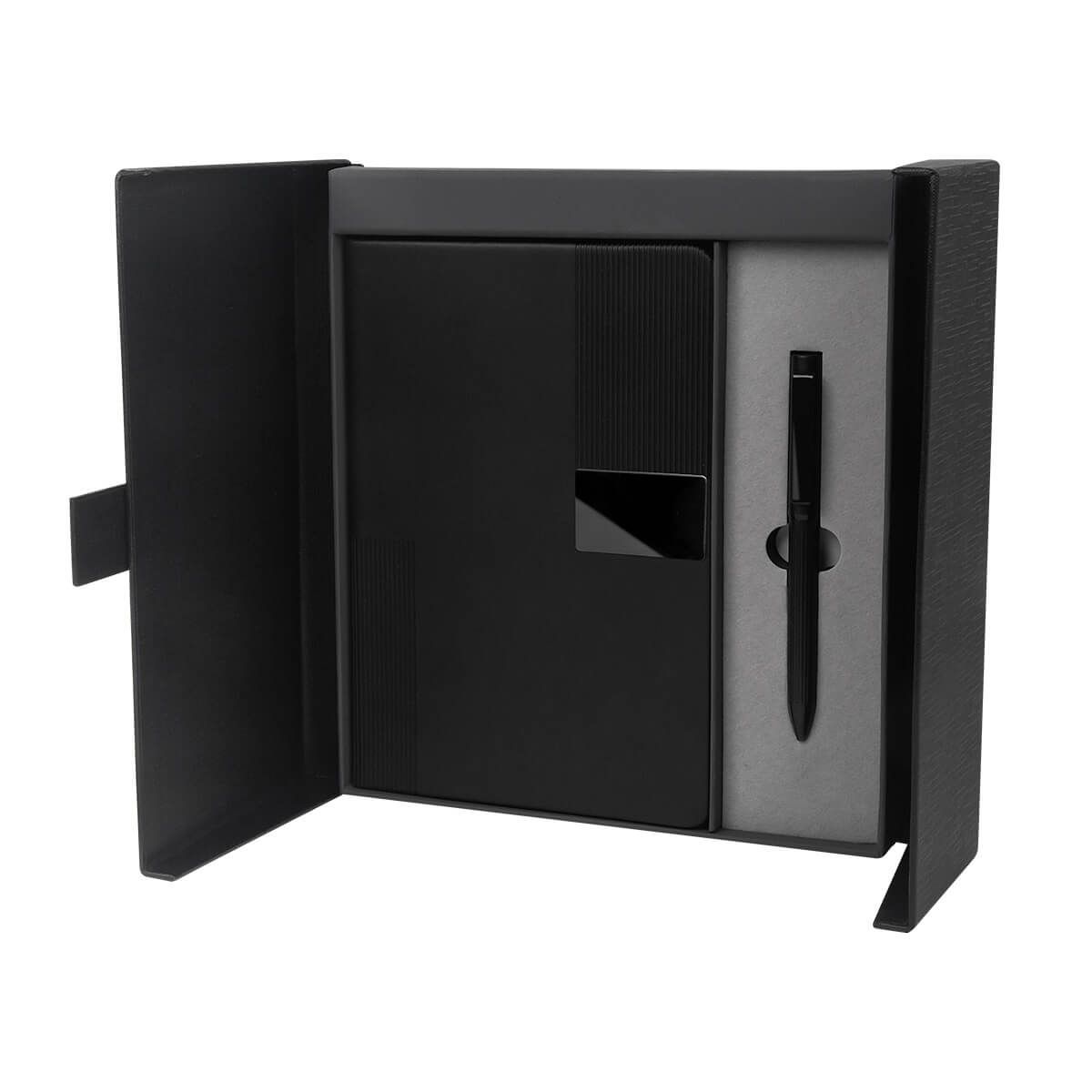 Elegante Set con caja de regalo. Incluye libreta con 100 hojas a rayas, cubierta rígida de curpiel y listón separador. Su placa metálica le aporta un toque distinguido y de buen gusto, que además se complementa con su diseño y líneas de grabado. Incluye un bolígrafo de metal en terminado mate con sistema twist y además, cuenta con caja de regalo con nuevo sistema de cierre imantado.