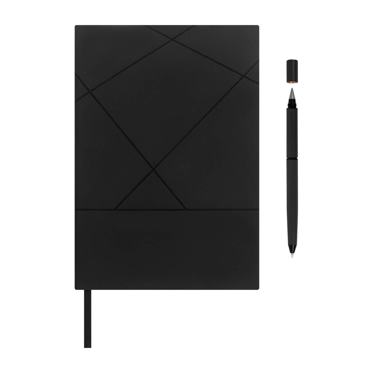 Elegante y original set de regalo que consta de libreta con 100 hojas a rayas, cubierta rígida de curpiel y listón separador. Como complemento, cuenta con un bolígrafo de metal con terminado mate, con punta clásica y la funcionalidad de un lápiz infinito en la parte superior. Incluye caja de regalo con cierre imantado y asas de fino material, que le dan un toque más sofisticado.