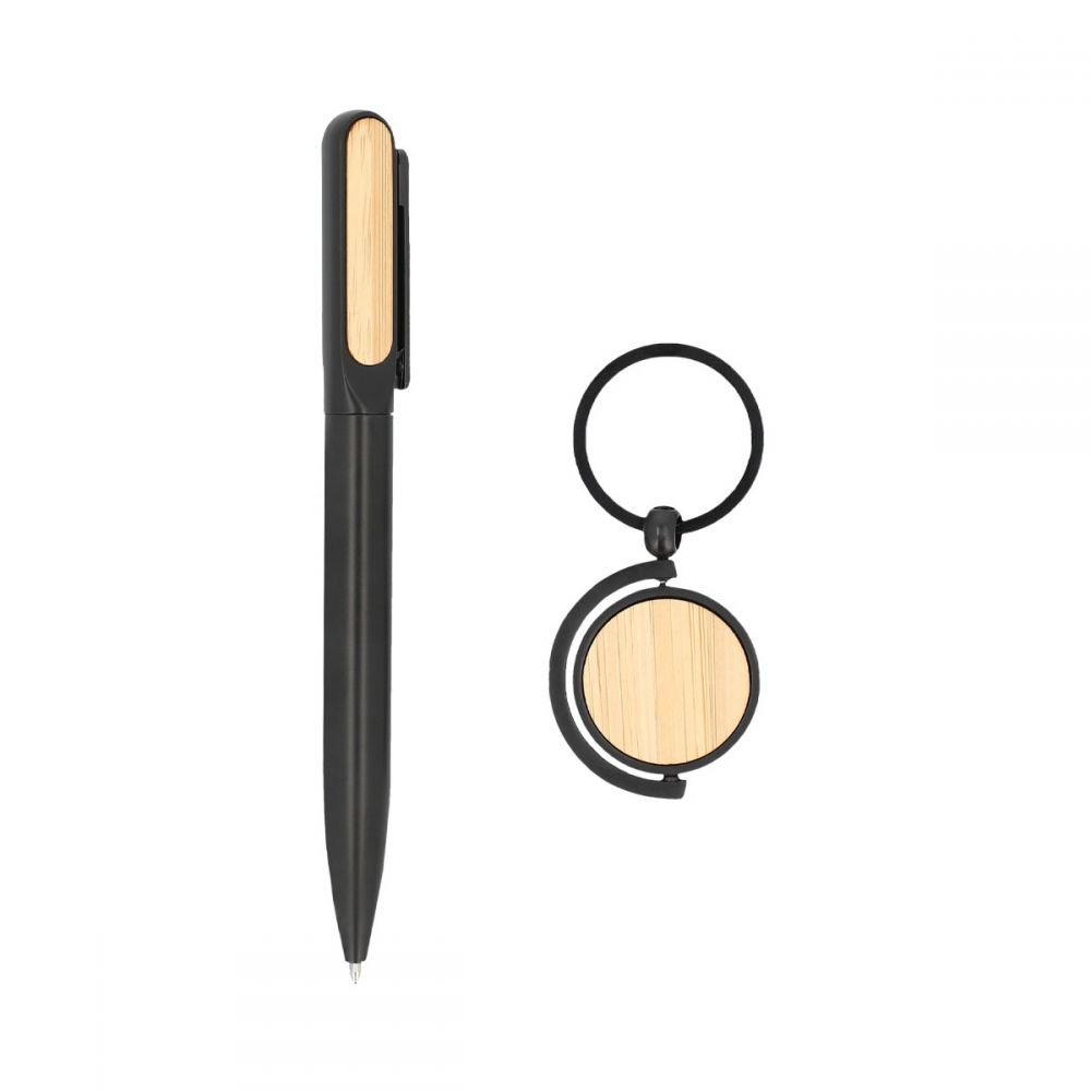 Set de oficina con bolígrafo, llavero y estuche. Bolígrafo con mecanismo twist.