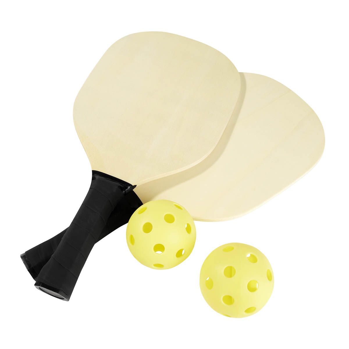 Set de raquetas para pickleball. Incluye dos raquetas de madera con mango ergonómico, dos pelotas de plástico y bolsa con malla para transportar. Este set es ideal tanto para los que buscan disfrutar del deporte en cualquier lugar.