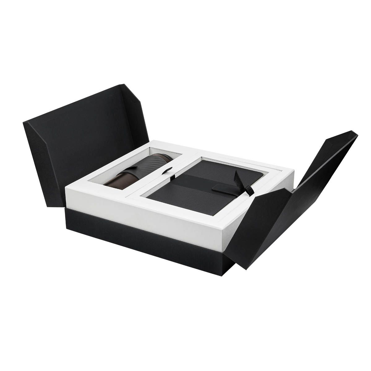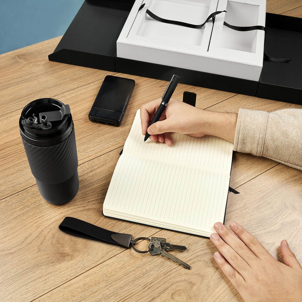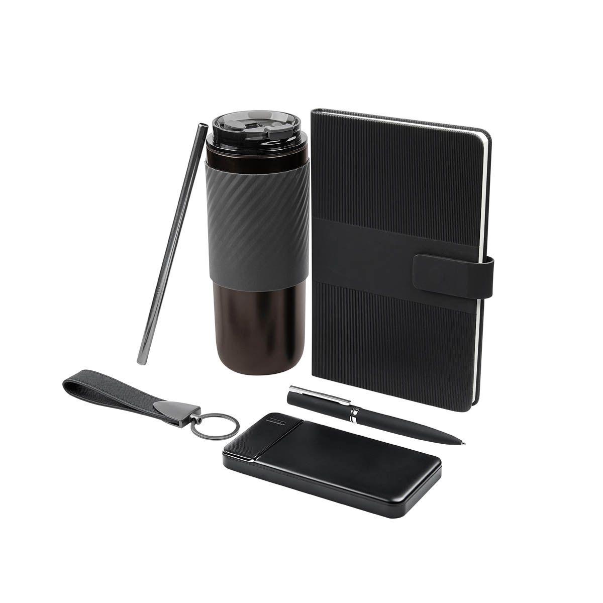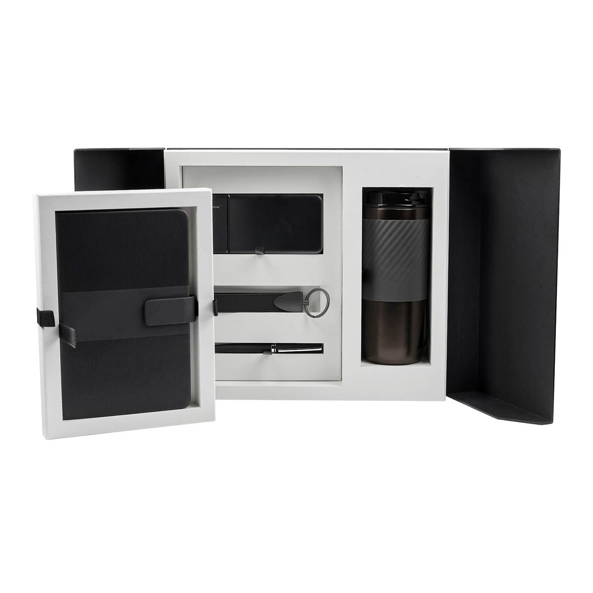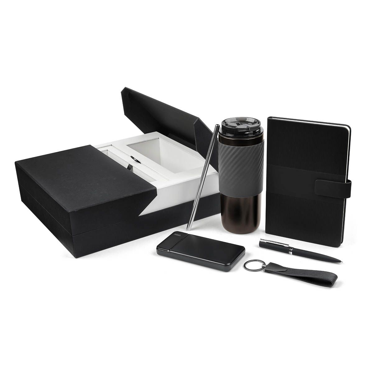 Exclusivo set de regalo. Opción perfecta para un obsequio de alto valor y calidad. Este set viene en una elegante caja negra con solapa de abertura central, lo que no solo proporciona un acceso fácil al contenido, sino que también añade un toque sofisticado al diseño. El interior de la caja presenta un color neutro que realza el aspecto general, creando un hermoso contraste con el exterior negro. Incluye termo con doble pared metálica, cerrado al vacío, tapa con sistema de rosca, sobretapa de push y ranura especial con tapón para popote, también incluye popote metálico con boquilla de silicón. Libreta de 80 hojas de raya, cubierta rígida de curpiel, separador interno y broche magnético. Bolígrafo metálico con sistema twist y terminado rubber. Llavero metálico combinado con curpiel, aro con giro de 360°. Batería auxiliar para smartphone de 10,000 mAh, incluye 2 puertos USB, 1 micro USB y 4 LEDs indicadores de carga.