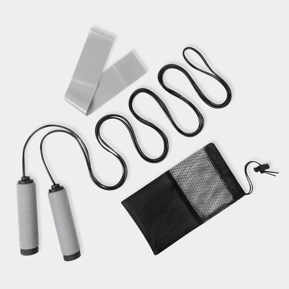 Set deportivo con accesorios para entrenamiento funcional. Contiene una cuerda para saltar y una banda de resistencia. Ligero, práctico y listo para acompañarte en cada rutina. Incluye bolsa con jareta.
