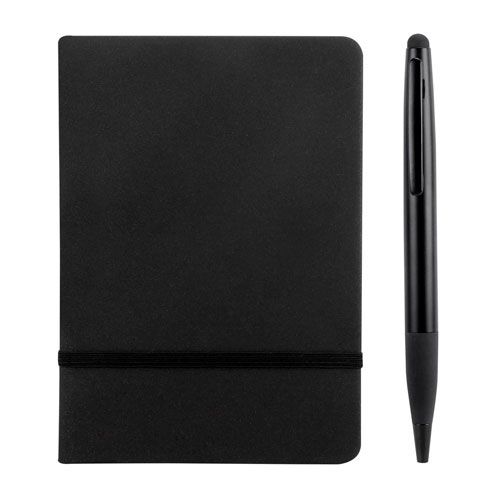 Set que incluye libreta con 80 hojas a rayas, separador de hojas y elástico para cerrar, bolígrafo y caja de regalo.