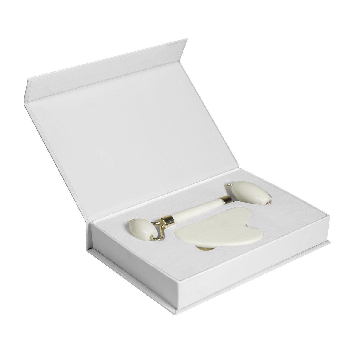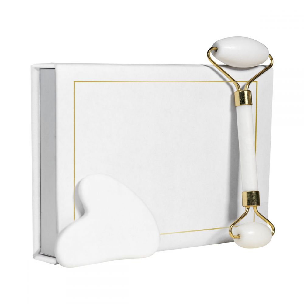Set masajeador facial. Incluye 1 rodillo para estimular y masajear la piel, para mejorar la circulación sanguínea y reducir la hinchazón facial. Piedra facial Gua Sha, para aplicar presión y realizar movimientos de deslizamiento sobre la piel. Ayuda a aliviar la tensión muscular y a mejorar la absorción de productos para el cuidado de la piel. Caja individual con cierre imantado.