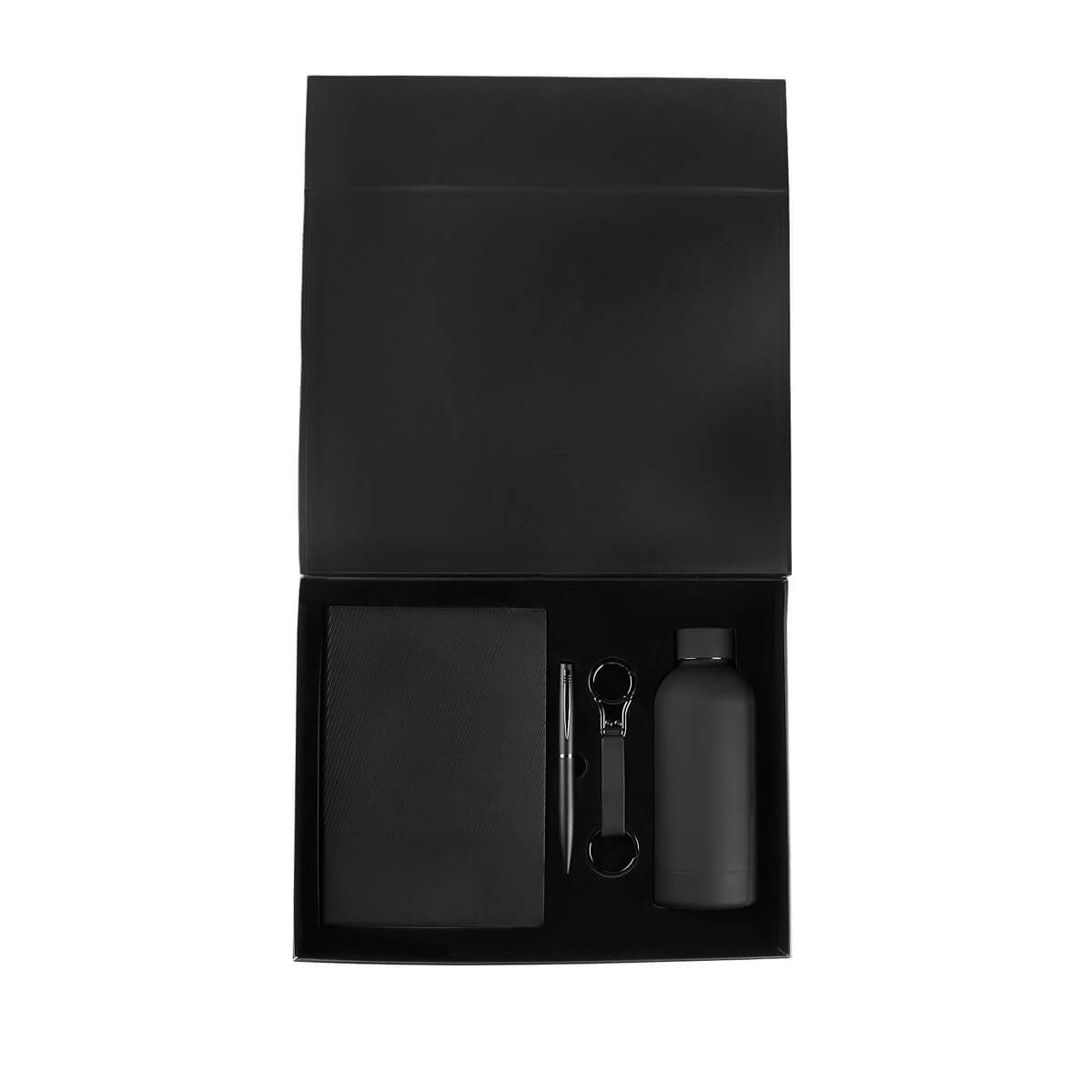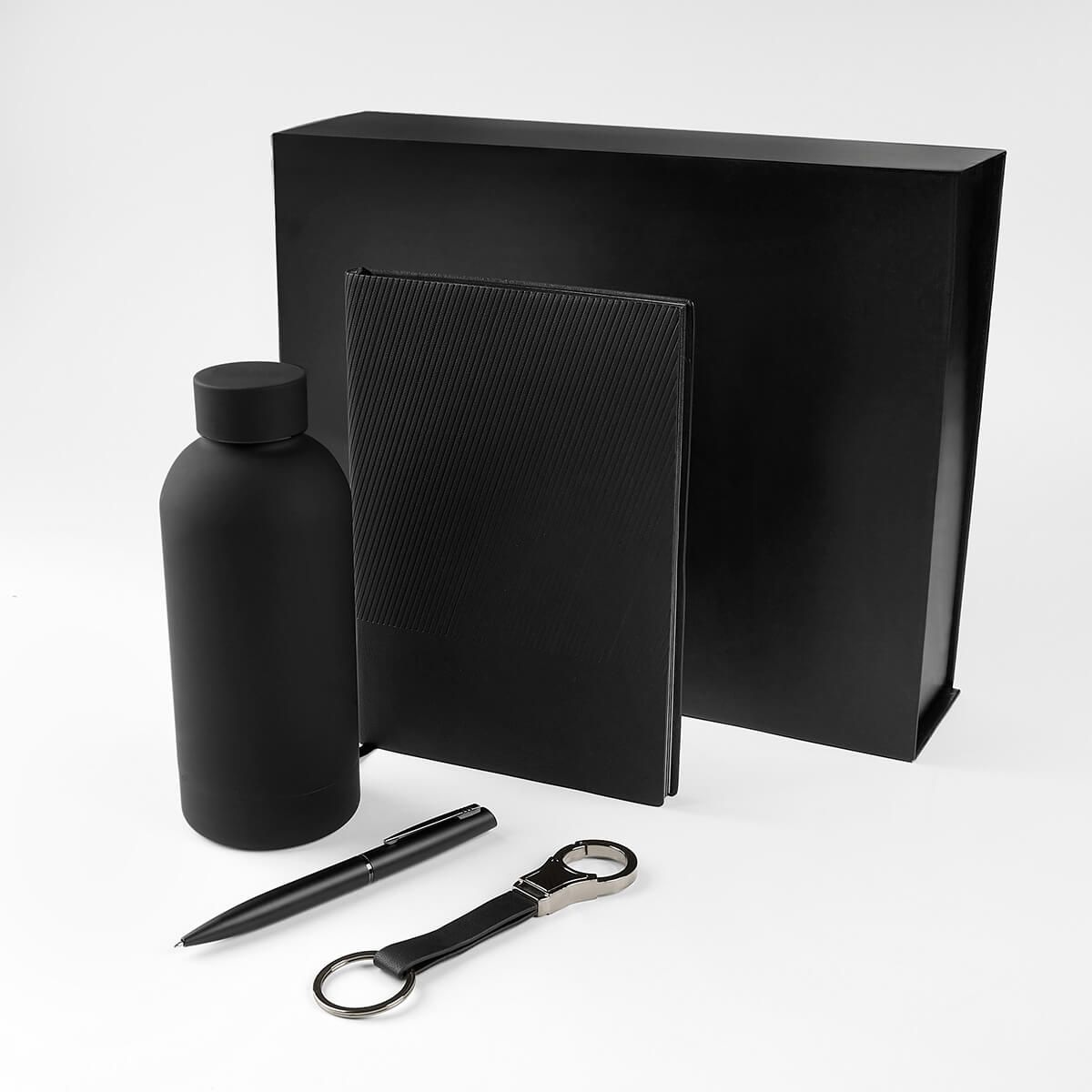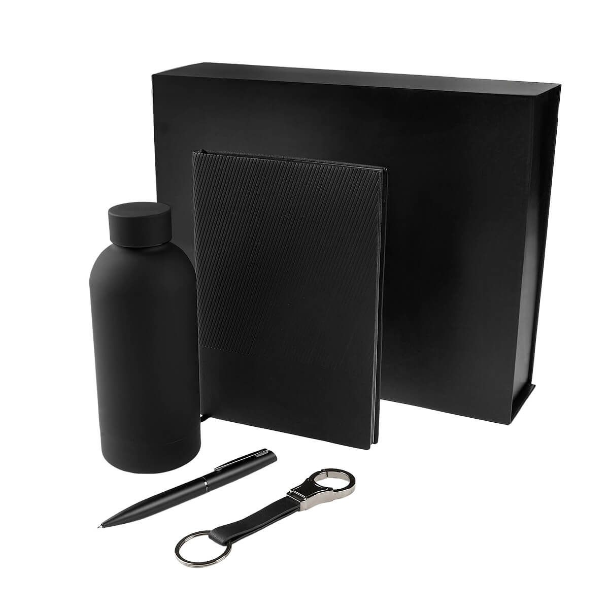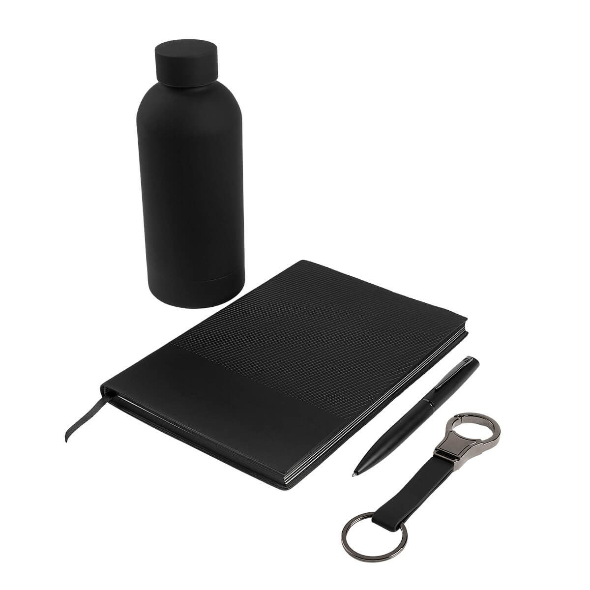 Set de regalo corporativo de 4 piezas. Incluye libreta de pasta blanda con 96 hojas a raya y listón separador, bolígrafo metálico con sistema twist, llavero de doble aro metálico con cinta de curpiel y termo de acero inoxidable de doble pared cerrado al vacío, terminado rubber que lo hace suave al tacto. Incluye caja rígida de regalo.