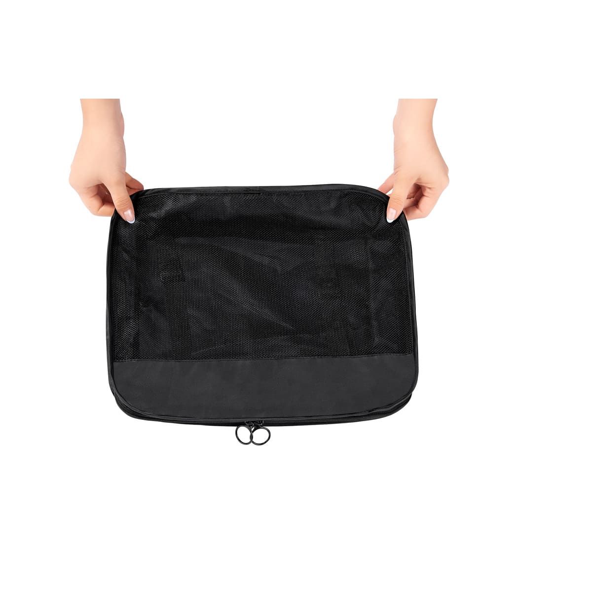 Organizador de maleta 8 en 1. Incluye 3 bolsas para ropa con malla para una mejor ventilación, la bolsa grande y mediana incluyen dos sujetadores interiores con broche de plástico para organizar tus artículos, además de broches de plástico que te permiten unir las diferentes piezas, 1 bolsa con cierre y asa para ropa interior, 1 bolsa con cierre para calzado, 1 bolsa con cierre tipo jareta, 1 bolsa chica con cierre y 1 bolsa cosmetiquera con malla.