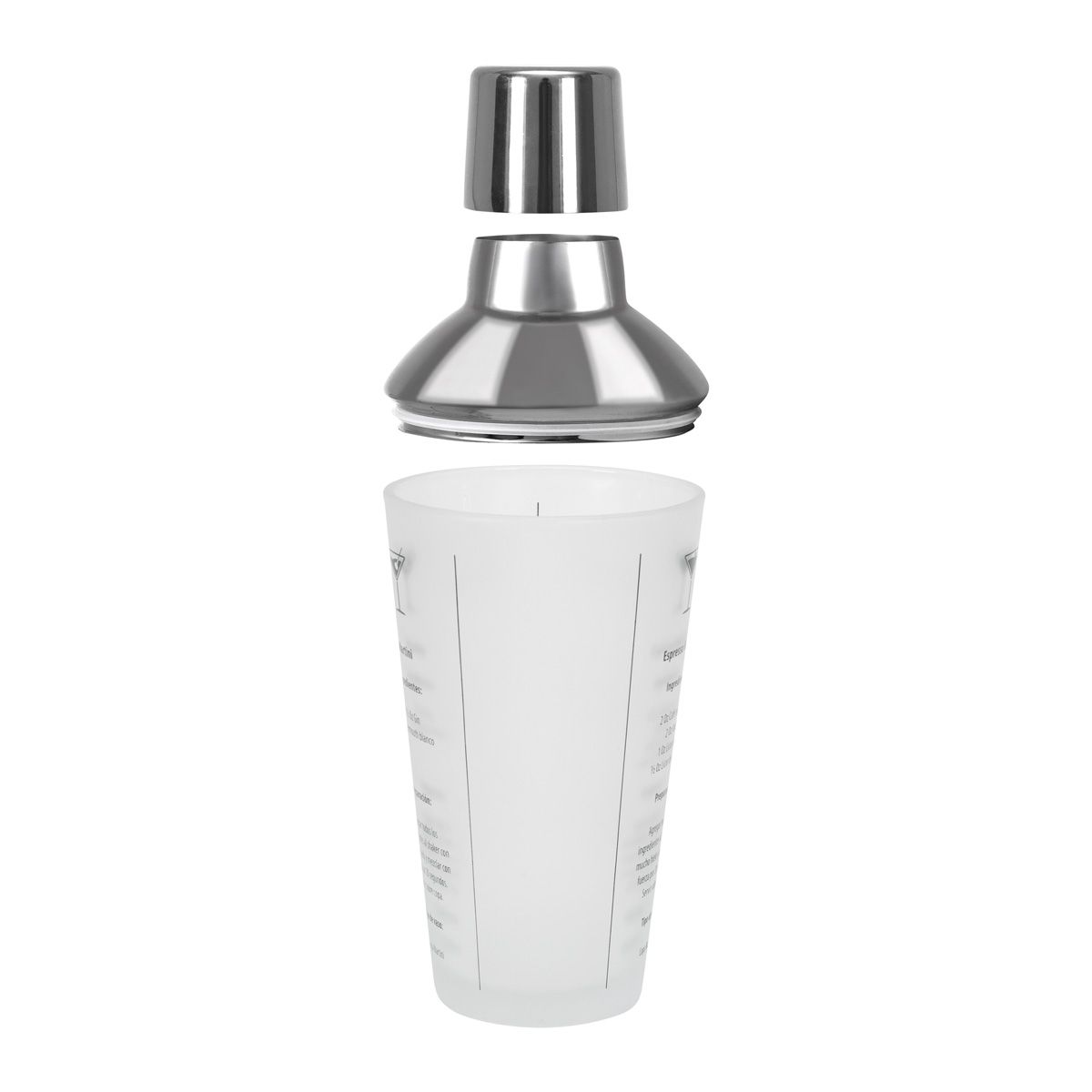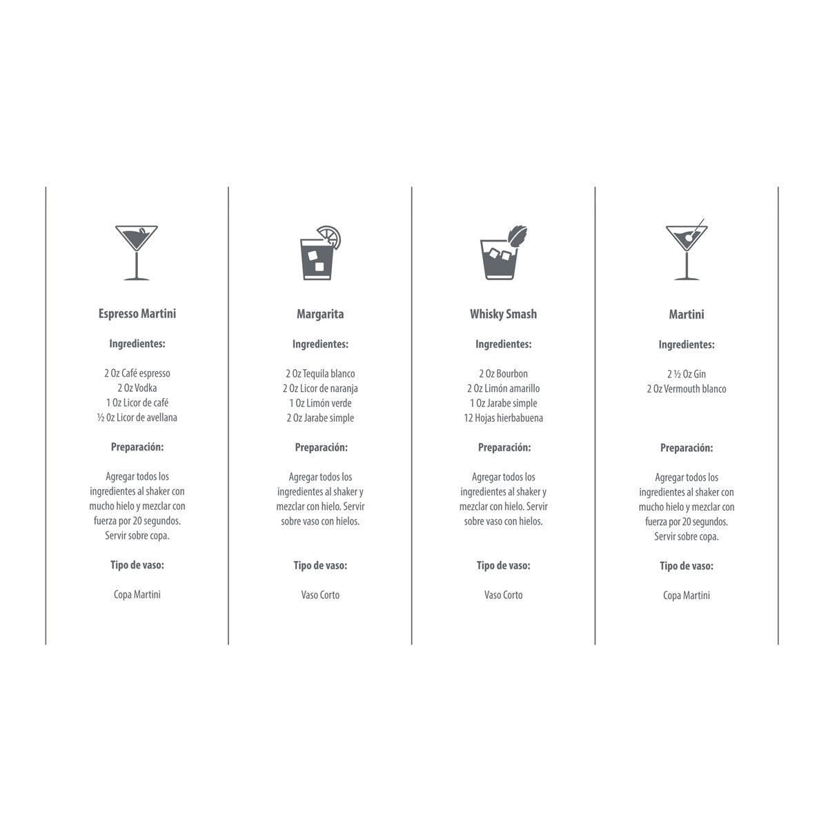 Shaker de cristal con 4 recetas incluidas. Conviértete en el barman perfecto con este shaker diseñado para facilitar la preparación de cócteles profesionales en casa, guiándote paso a paso para crear bebidas como un experto. Podrás preparar un expresso martini, margarita, whisky smash o martini. Incluye caja individual.