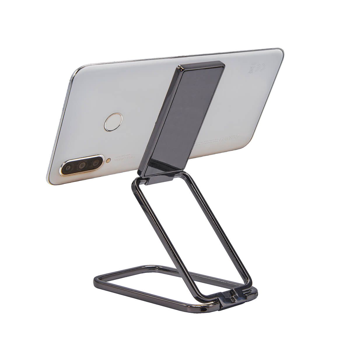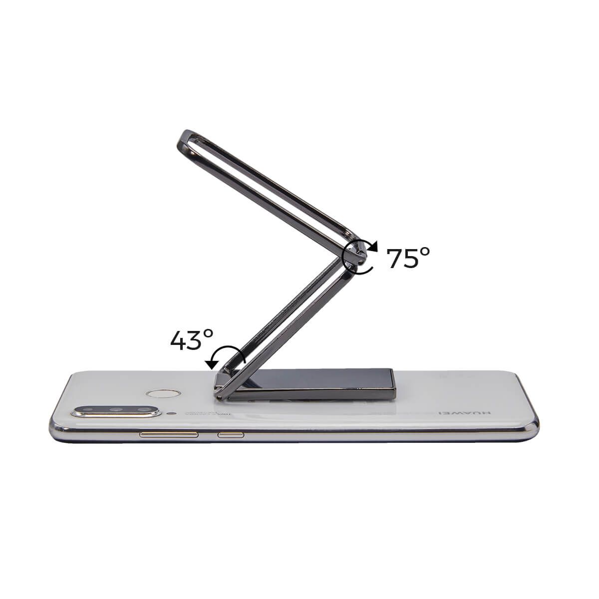 Soporte adherible para smartphone o tablet. Diseño plegable para ajustar en diferentes posiciones, dos brazos ajustables para proporcionar más ángulos de visión y rotación de 360° en la base.