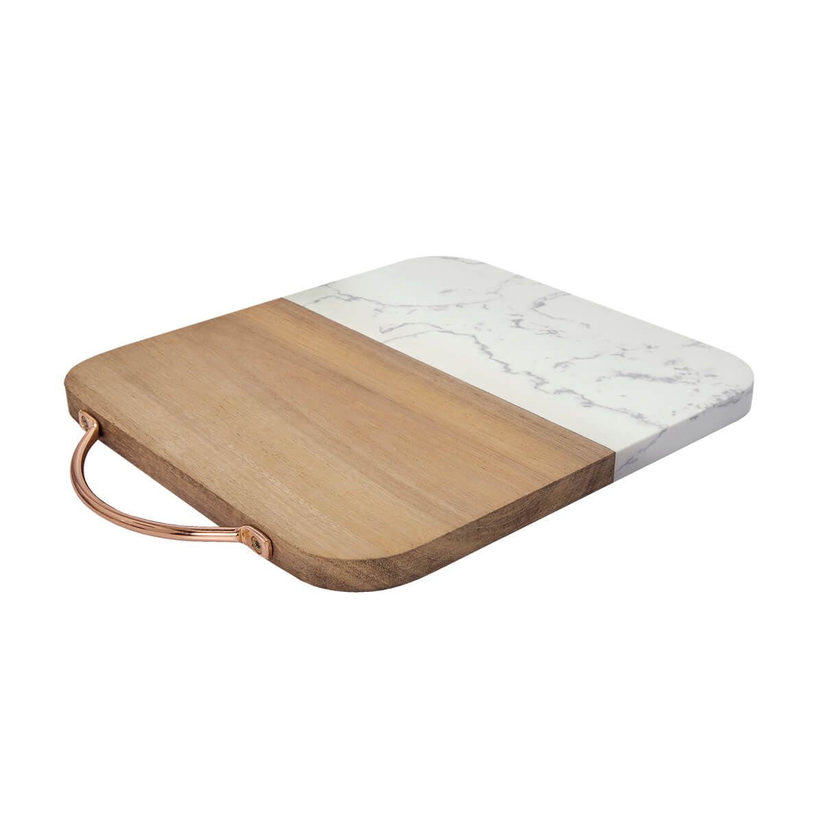 Tabla de cocina de mármol con madera y asa metálica color oro rosado. Incluye caja individual. La madera es un producto natural el cual puede presentar variaciones en tonalidades y vetas. Este producto por ser últimas piezas puede presentar alguna variación, no se aceptan devoluciones.