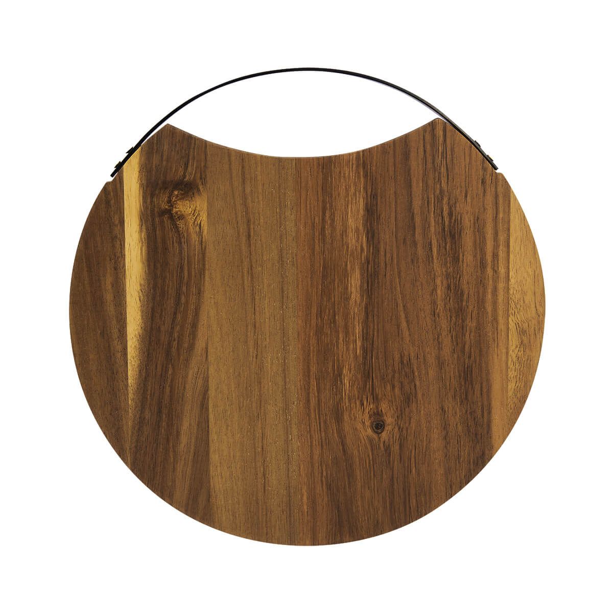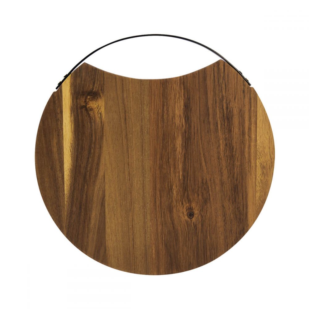 Tabla redonda para cocina con asa metálica en color negro. Incluye caja individual. La madera es un producto natural el cual puede presentar variaciones en tonalidades y vetas.
