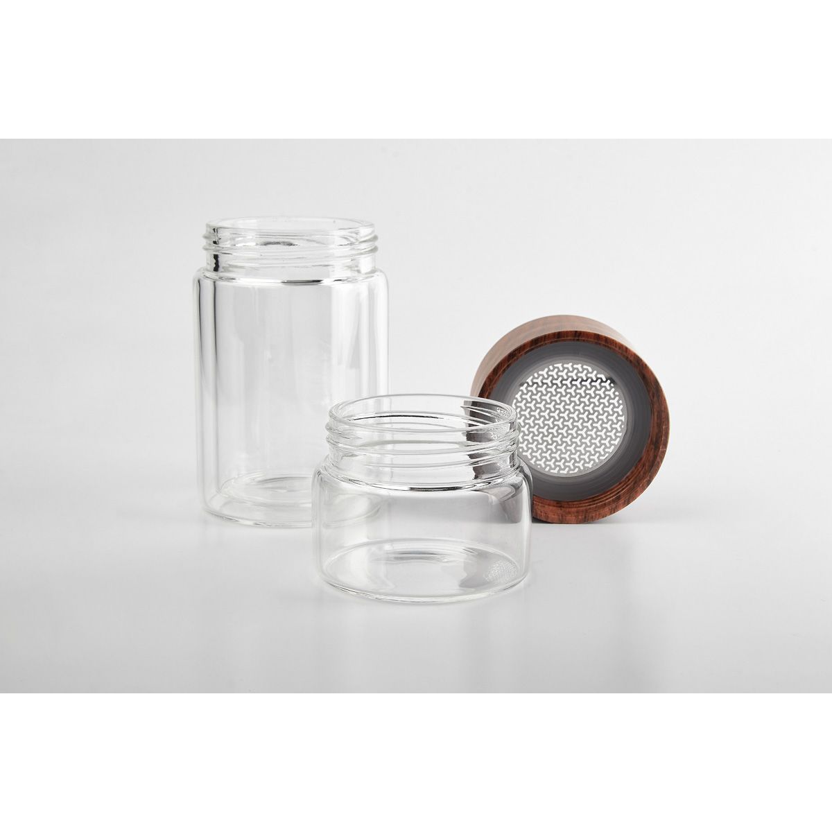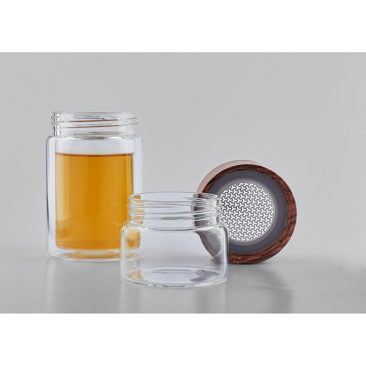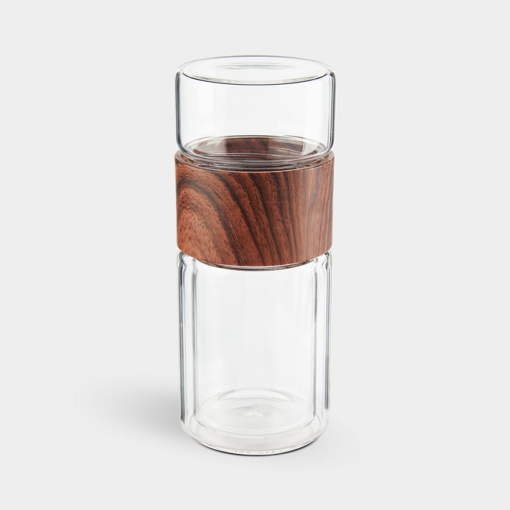 Termo de vidrio de doble pared para bebidas calientes y frías. Tapa de rosca que evita derrames. Contiene una separación de infusor removible para té de acero inoxidable. Su colador y doble vaso permiten preparar infusiones. Incluye caja individual.