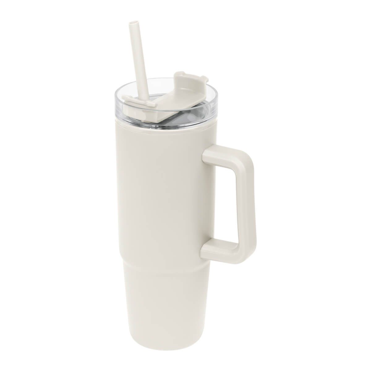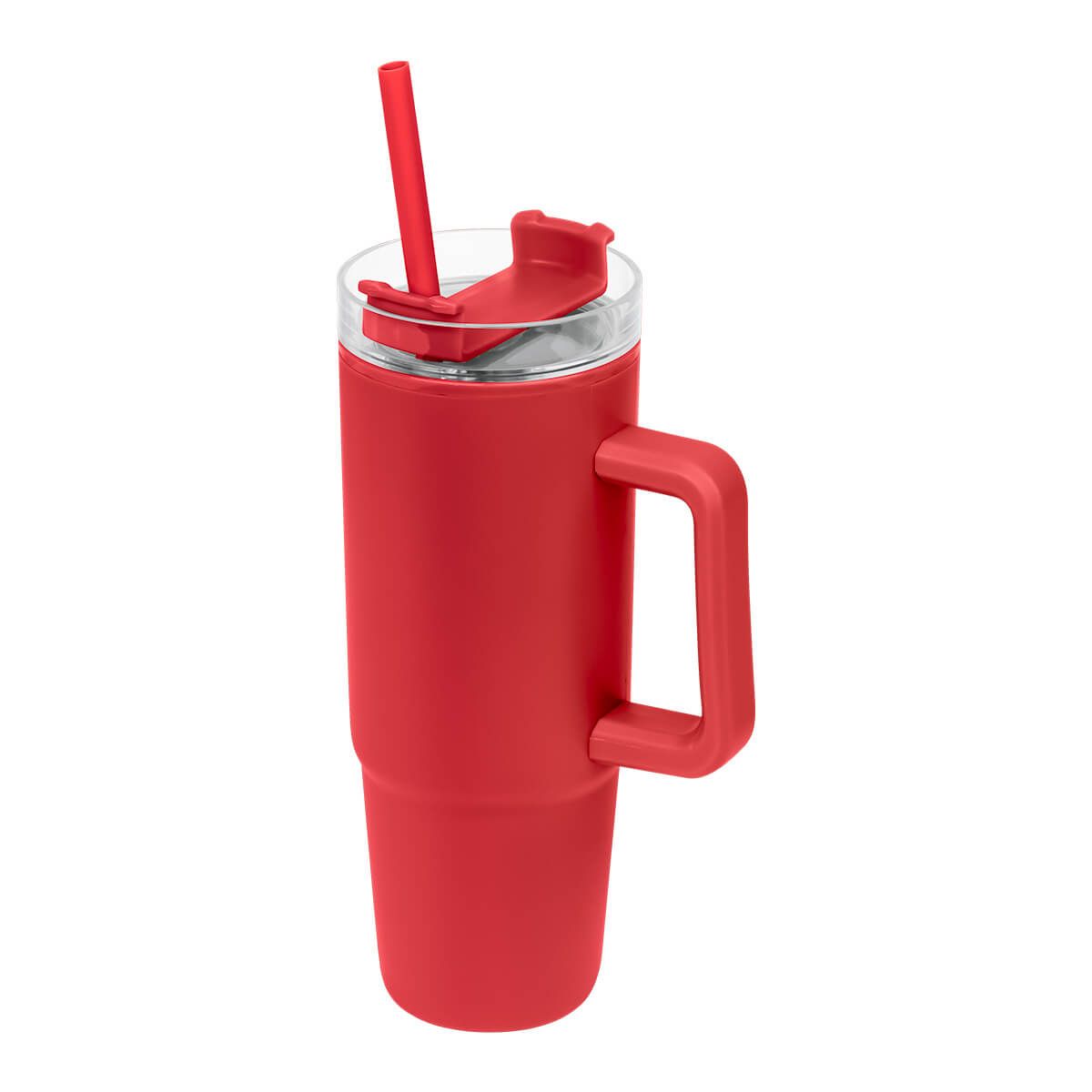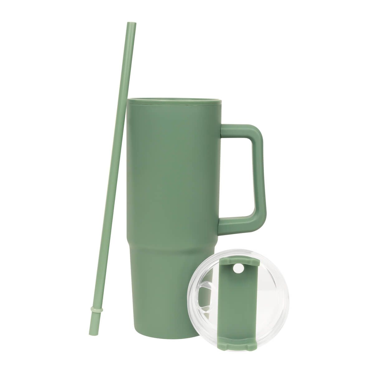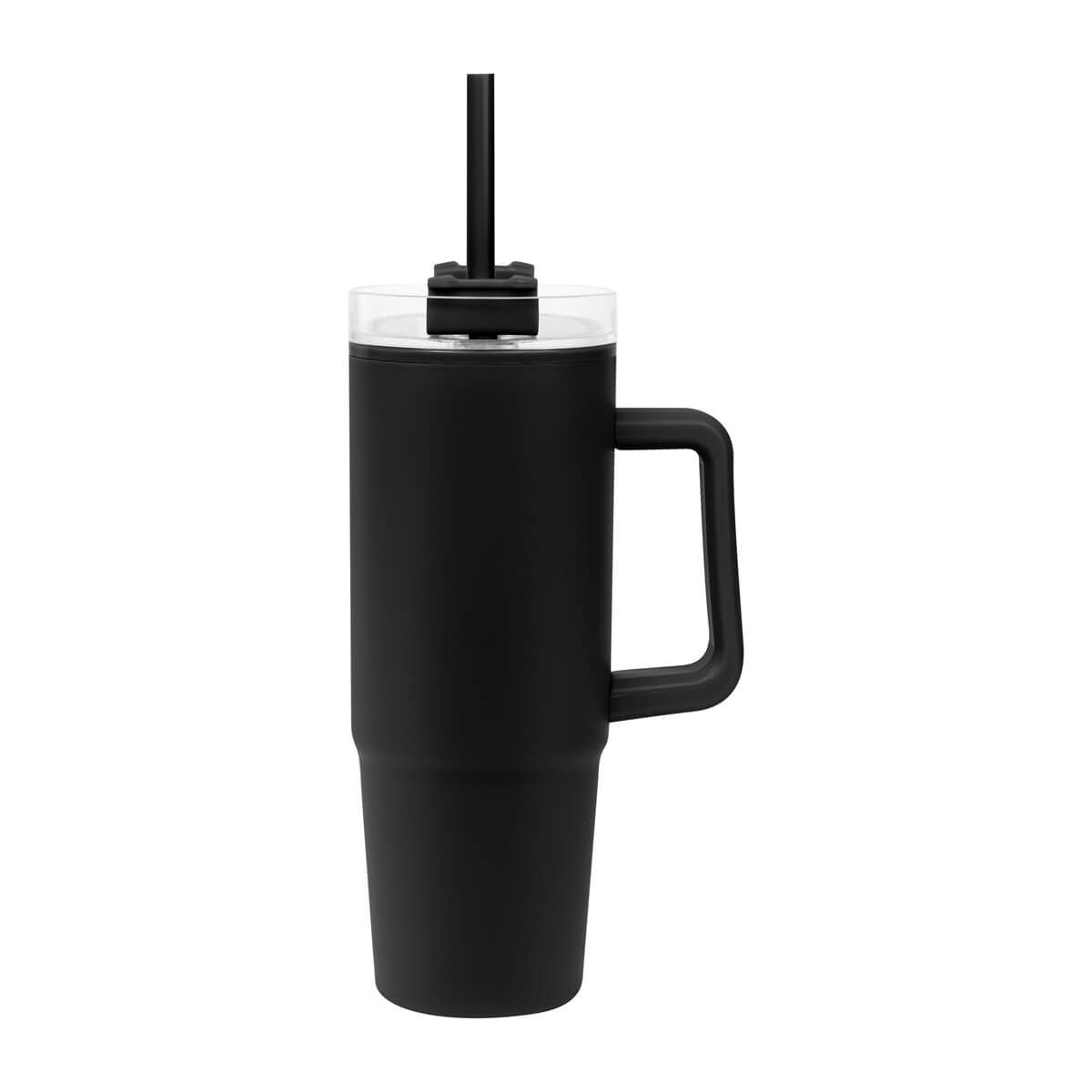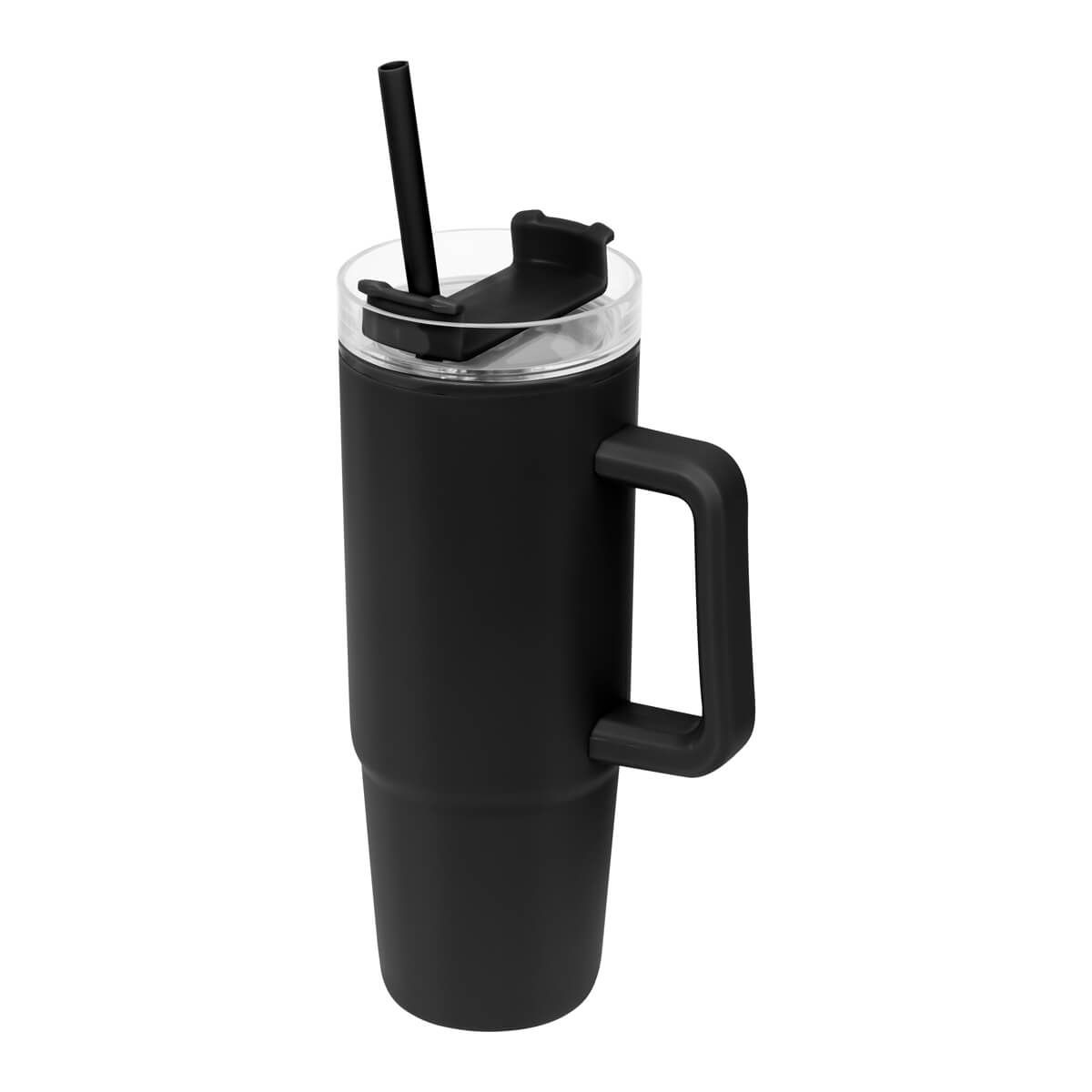 De doble pared. Pared interna y externa de plástico. Tapa de plástico con cierre de rosca. Sobre tapa giratoria de plástico con opción para beber con popote o boquilla tradicional. Capacidad de 30 Oz. Base de 7 cm de diámetro. Incluye popote de plástico y caja individual.