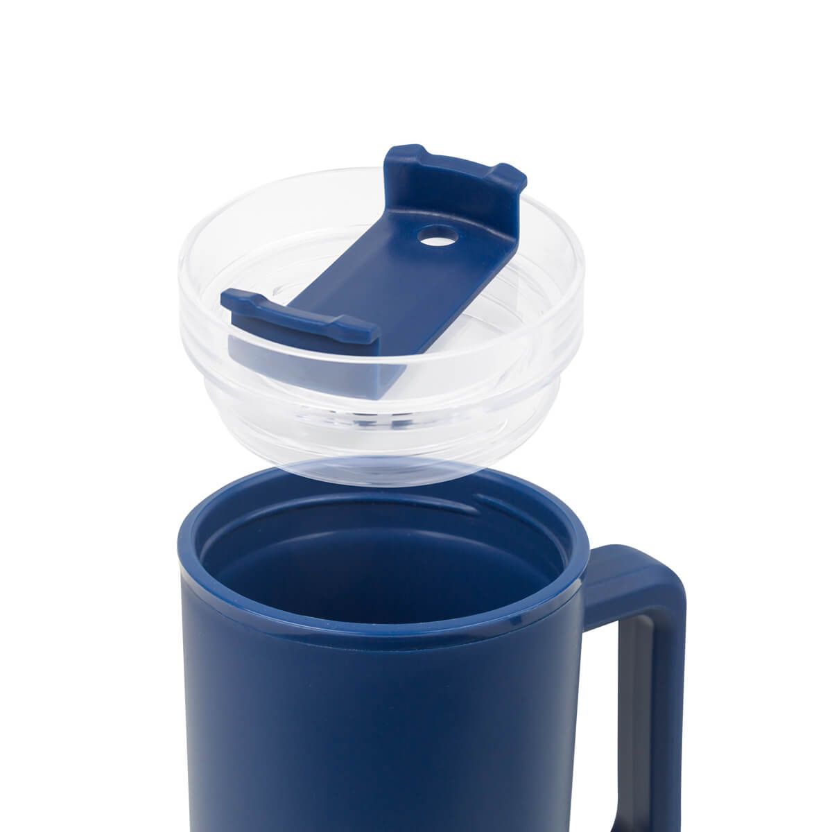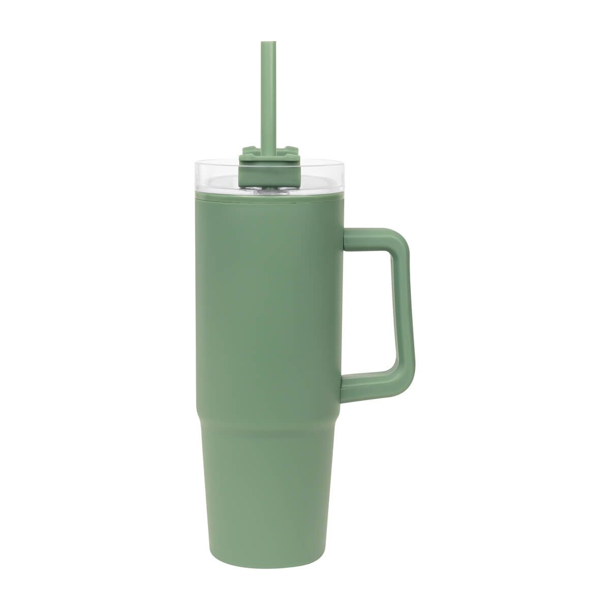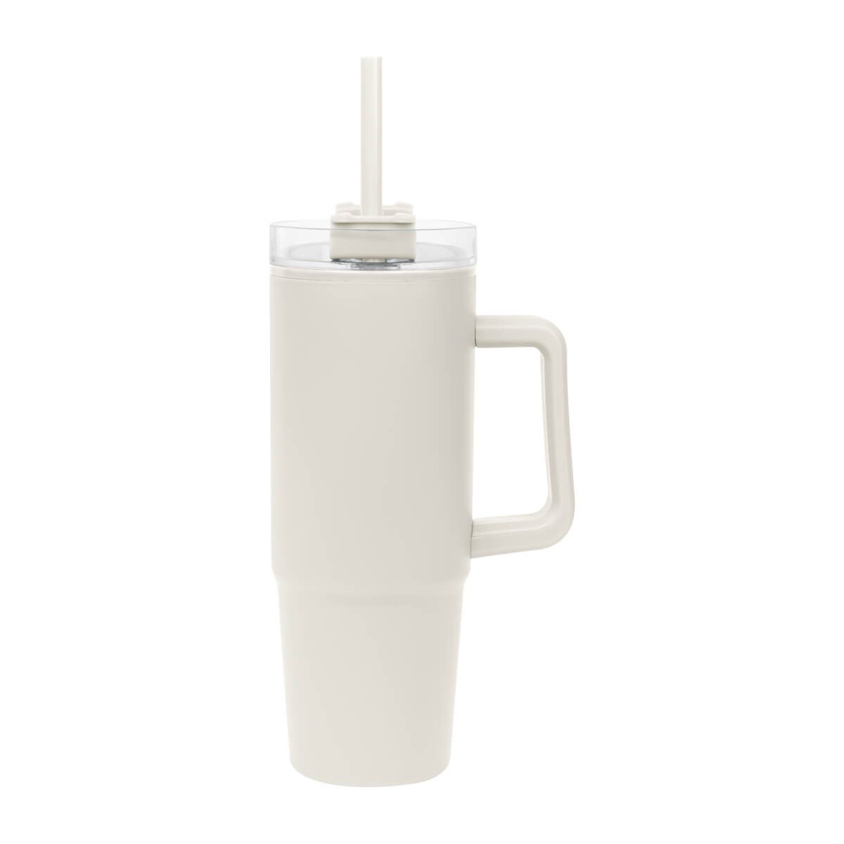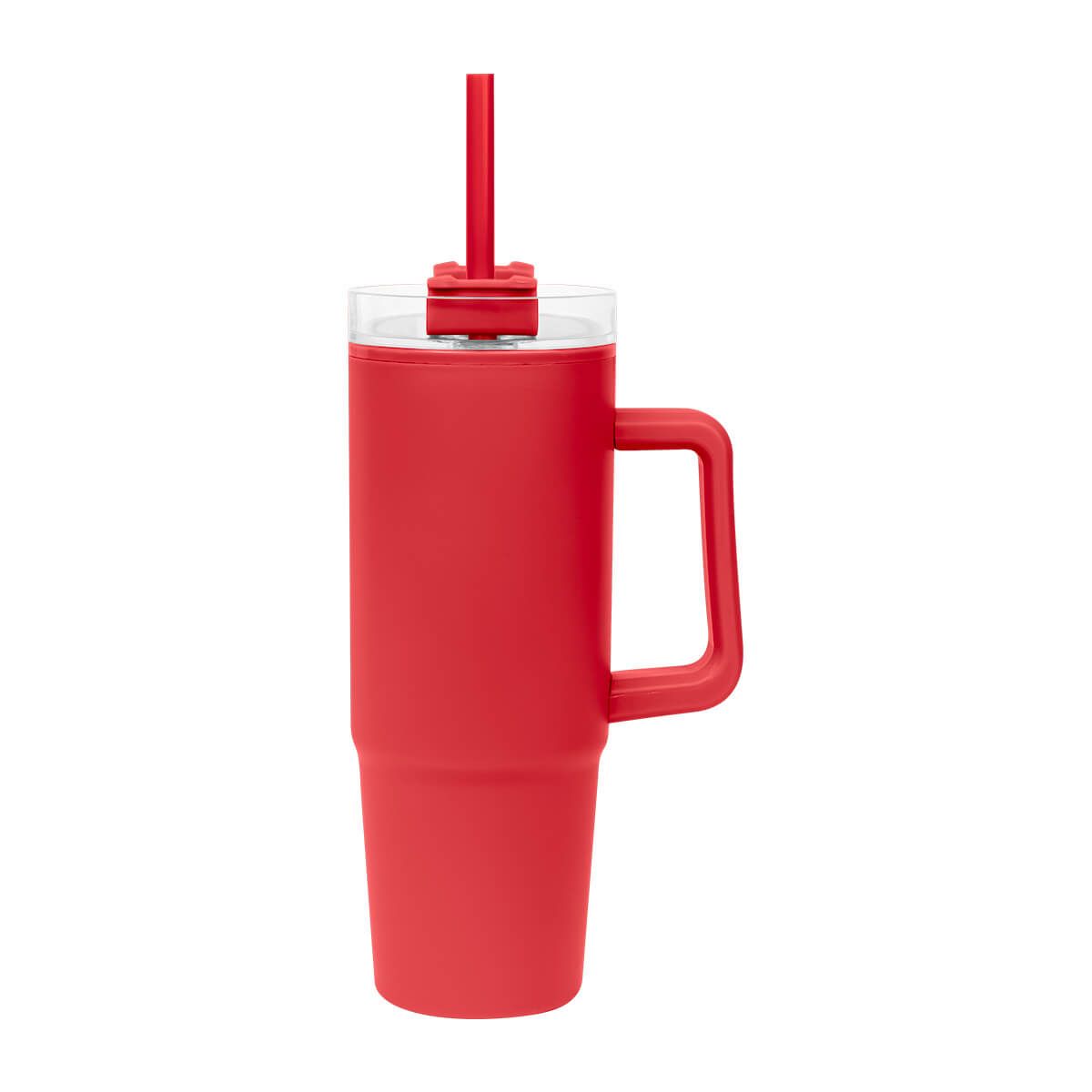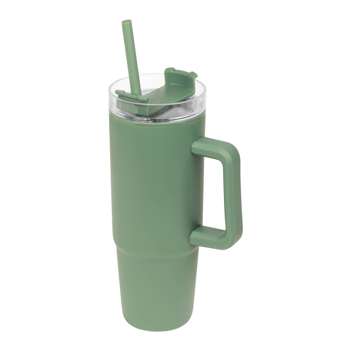 De doble pared. Pared interna y externa de plástico. Tapa de plástico con cierre de rosca. Sobre tapa giratoria de plástico con opción para beber con popote o boquilla tradicional. Capacidad de 30 Oz. Base de 7 cm de diámetro. Incluye popote de plástico y caja individual.