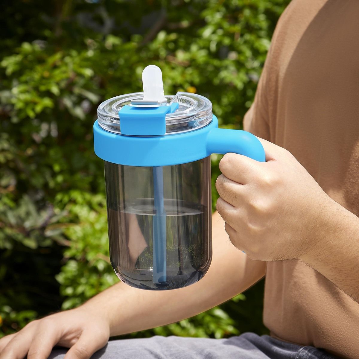 Termo de plástico de una pared. Tapa de plástico con sistema de rosca, sobre tapa con sistema de push y boquilla plegable con popote integrado. Es fácil de usar y perfecto para llevar en cualquier actividad. Su asa grande y ergonómica, permite un agarre más cómodo. Su combinación de colores, con un cuerpo oscuro translúcido y acentos en color sólido en el asa, popote y tapa, le da un toque moderno y atractivo. Incluye caja individual.